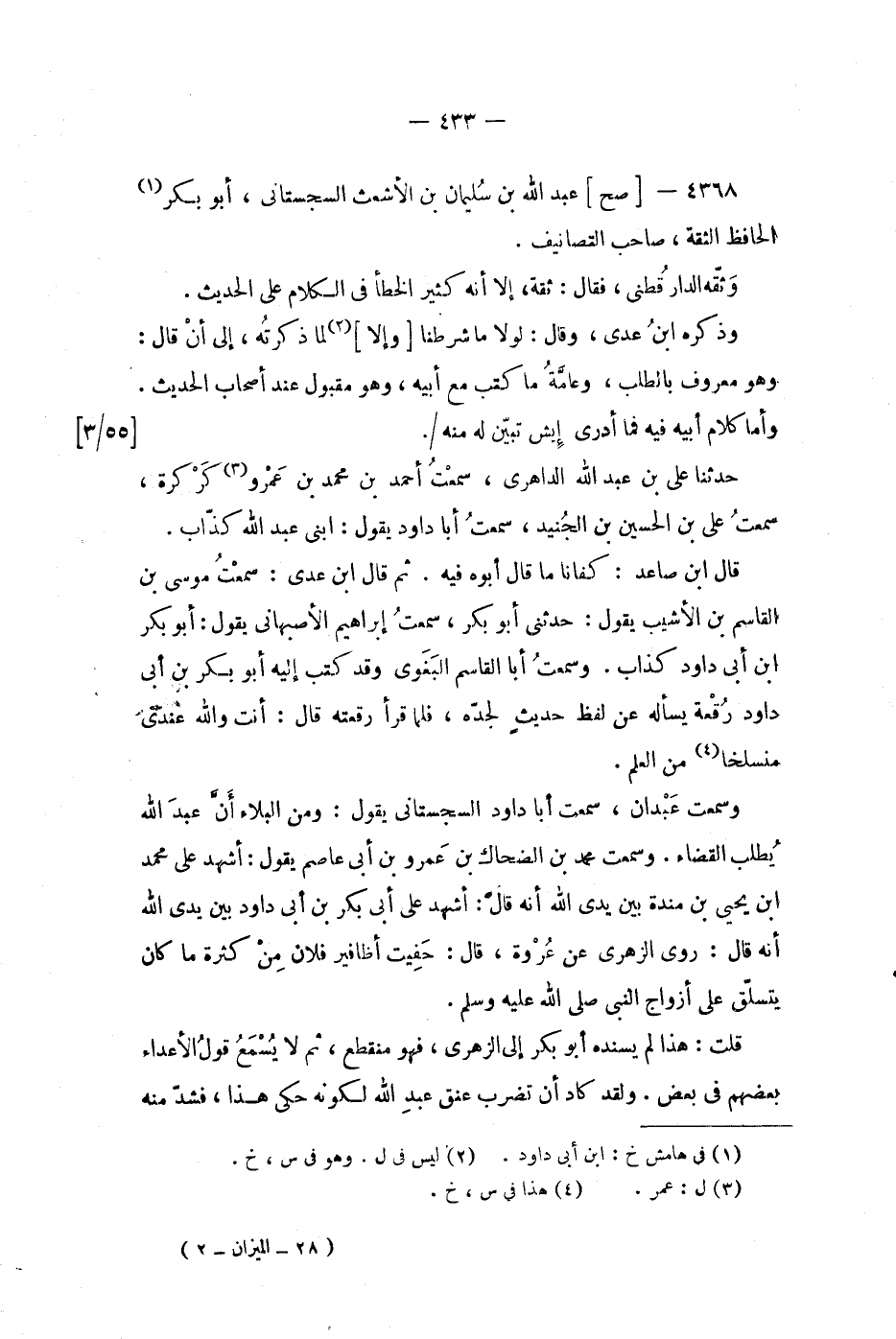 4368 -[صح] عبد الله بن سليمان بن الأشعث السجستاني، أبو بكر (1) الحافظ الثقة، صاحب التصانيف.