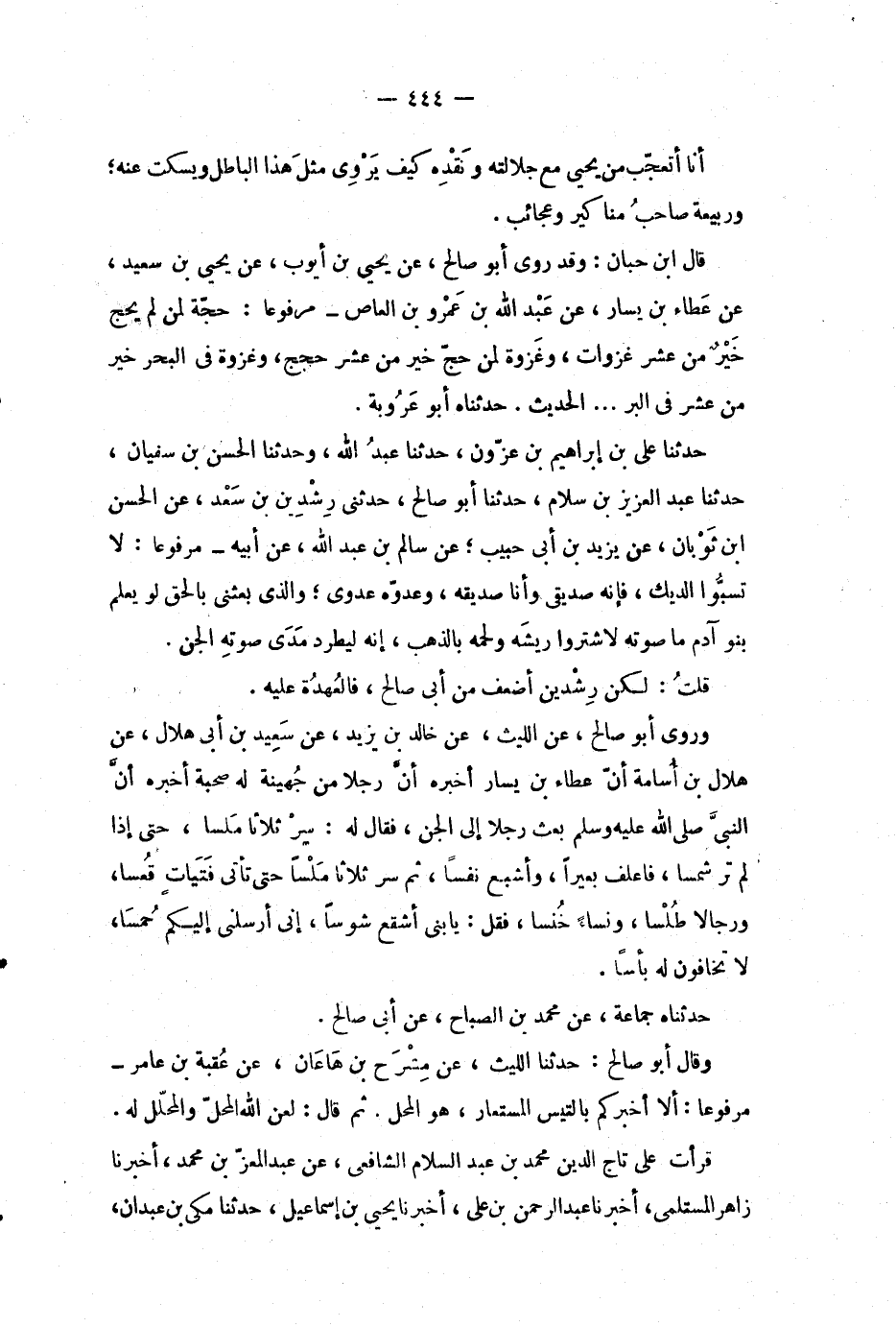 قال ابن حبان: وقد روى أبو صالح، عن يحيى بن أيوب، عن يحيى بن سعيد، عن عطاء بن يسار، عن عبد الله بن عمرو بن العاص - مرفوعاً: حجة لمن لم يحج خير من عشر غزوات، وغزوة لمن حج خير من عشر حجج، وغزوة في البحر خير من عشر في البر..الحديث.