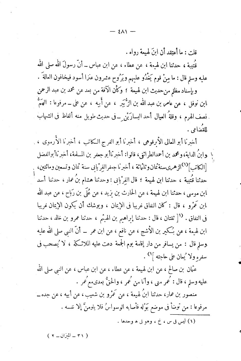 منصور بن عمار، حدثنا ابن لهيعة، عن عمرو بن شعيب، عن أبيه، عن جده - مرفوعاً: من توضأ في موضع بوله فأصابه الوسواس فلا يلومن إلا نفسه.