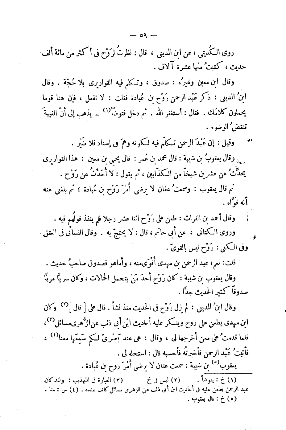 وقال ابن المدينى: ذكر عبد الرحمن روح بن عبادة فقلت: لا تفعل، فإن هنا قوما يحملون كلامك.