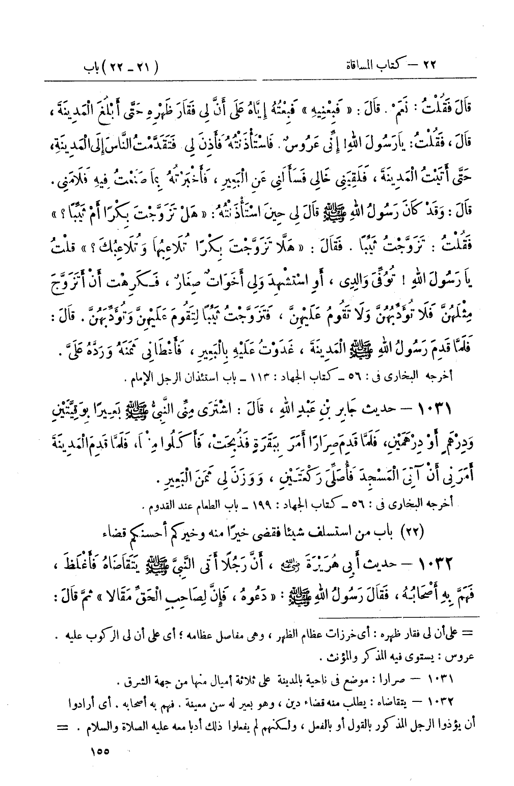 1031 - حديث جَابِرِ بْنِ عَبْدِ اللهِ، قَالَ: اشْتَرَى مِنِّي النَّبِيُّ صَلَّى اللَّهُ عَلَيْهِ وَسَلَّمَ بَعِيرًا بِوَقِيَّتَيْنِ وَدِرْهَمٍ أَوْ دِرْهَمَيْنِ، فَلَمَّا قَدِمَ صِرَارًا أَمَرَ بِبَقَرَةٍ فَذُبِحَتْ، فَأَكَلُوا مِنْهَا، فَلَمَّا قَدِمَ الْمَدِينَةَ أَمَرَنِي أَنْ آتِيَ الْمَسْجِدَ فَأُصَلِّيَ رَكْعَتَيْنِ، وَوَزَنَ لِي ثَمَنَ الْبَعِيرِ