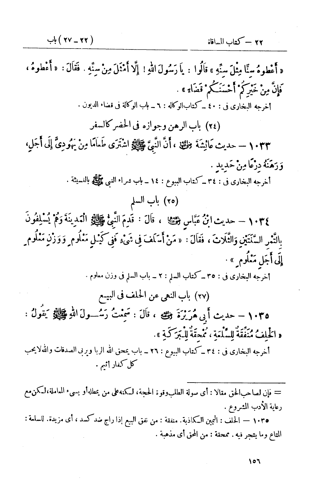 1034 - حديث ابْنُ عَبَّاسٍ، قَالَ: قَدِمَ النَّبِيُّ صَلَّى اللَّهُ عَلَيْهِ وَسَلَّمَ الْمَدِينَةَ وَهُمْ يُسْلِفُونَ بِالتَّمْرِ السَّنَتَيْنِ وَالثَّلاَثَ، فَقَالَ: مَنْ أَسْلَفَ فِي شَيْءٍ فَفِي كَيْلٍ مَعْلُومٍ وَوَزْنٍ مَعْلُومٍ إِلَى أَجَلٍ مَعْلُومٍ