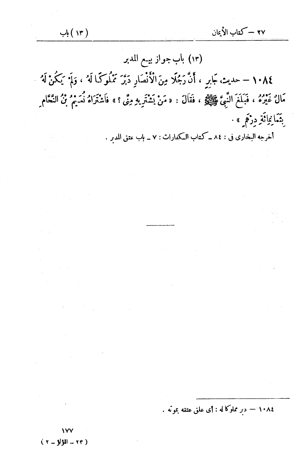 1084 - حديث جَابِرٍ، أَنَّ رَجُلاً مِنَ الأَنْصَارِ دَبَّرَ مَمْلُوكًا لَهُ، وَلَمْ يَكُنْ لَهُ مَالٌ غَيْرُهُ، فَبَلَغَ النَّبِيَّ صَلَّى اللَّهُ عَلَيْهِ وَسَلَّمَ، فَقَالَ: مَنْ يَشْتَرِيهِ مِنِّي فَاشْتَرَاهُ نعَيْمُ بْنُ النَّحَّامِ بِثَمَانِمِائَةِ دِرْهَمٍ