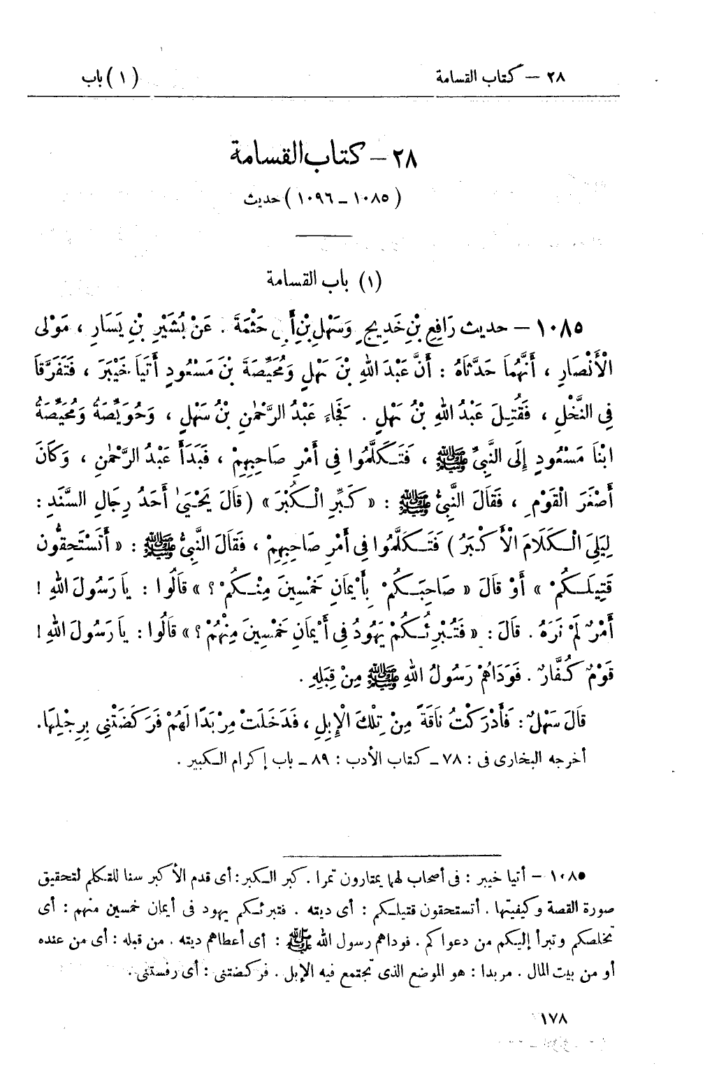 1085 - حديث رَافِعِ بْنِ خَدِيجٍ وَسَهْلِ بْنِ أَبِي حَثْمَةَ عَنْ بُشَيْرٍ بْنِ يَسَارِ، مَوْلَى الأَنْصَارِ، أَنَّهُمَا حَدَّثَاهُ: أَنَّ عَبْدَ اللهِ بْنَ سَهْلٍ وَمُحَيِّصَةَ بْنَ مَسْعُودٍ أَتَيَا خَيْبَرَ، فَتَفَرَّقَا فِي النَّخْلِ، فَقُتِلَ عَبْدُ اللهِ بْنُ سَهْلٍ فَجَاءَ عَبْدُ الرَّحْمنِ بْنُ سَهْلٍ، وَحُوَيِّصَةُ وَمُحَيِّصَةُ ابْنَا مَسْعُودٍ إِلَى النَّبِيِّ صَلَّى اللَّهُ عَلَيْهِ وَسَلَّمَ، فَتَكَلَّمُوا فِي أَمْرِ صَاحِبِهِمْ، فَبَدَأَ عَبْدُ الرَّحْمنِ، وَكَانَ أَصْغَرَ الْقَوْمِ، فَقَالَ النَّبِيُّ صَلَّى اللَّهُ عَلَيْهِ وَسَلَّمَ: كَبِّرِ الْكُبْرَ (قَالَ يَحْيى أَحَدُ رِجَالِ السَّنَدِ: لِيَلِيَ الْكَلاَمَ الأَكْبَرُ) فَتَكلَّمُوا فِي أَمْرِ صَاحِبِهِمْ، فَقَالَ النَّبِيُّ صَلَّى اللَّهُ عَلَيْهِ وَسَلَّمَ: أَتَسْتَحِقُّون قَتِيلَكُمْ أُوْ قَالَ صَاحِبَكُمْ بِأَيْمَانِ خَمْسِينَ مِنْكُمْ قَالُوا: يَا رَسُولَ اللهِ أَمْرٌ لَمْ نَرَهُ قَالَ: فَتُبْرِئُكُمْ يَهُودُ فِي أَيْمَانِ خَمْسِينَ مِنْهُمْ قَالُوا: يَا رَسُولَ اللهِ قَوْمٌ كُفَّارٌ فَوَدَاهُمْ رَسُولُ اللهِ صَلَّى اللَّهُ عَلَيْهِ وَسَلَّمَ مِنْ قِبَلِه