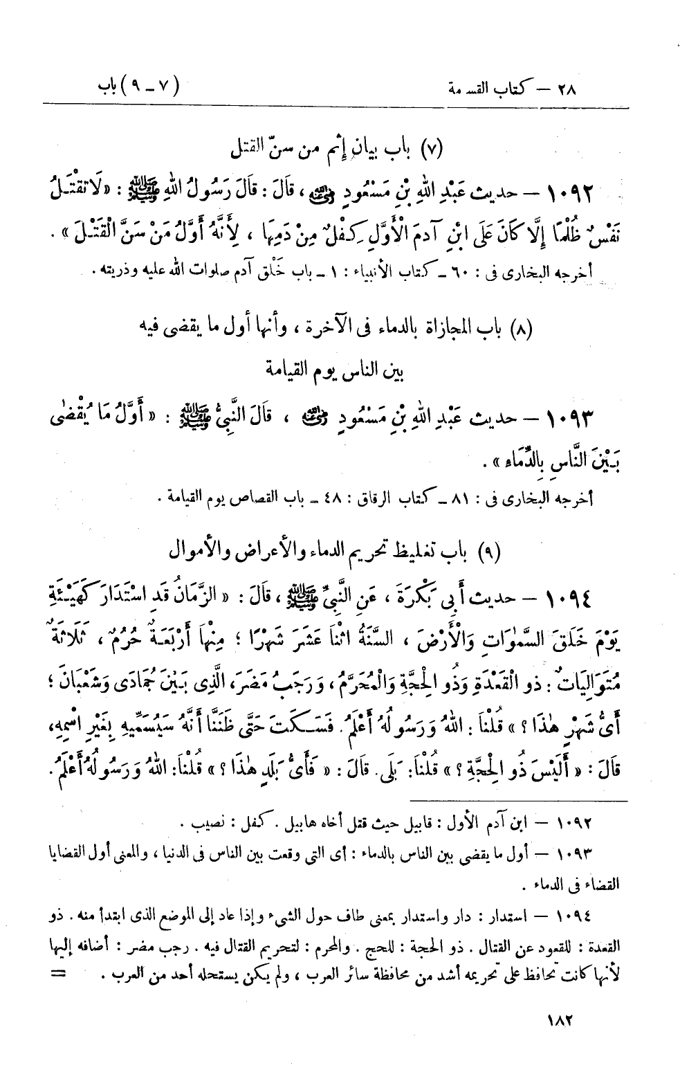 1093 - حديث عَبْدِ اللهِ بْنِ مَسْعُودٍ رضي الله عنه، قَالَ النَّبِيُّ صَلَّى اللَّهُ عَلَيْهِ وَسَلَّمَ: أَوَّلُ مَا يُقْضى بَيْنَ النَّاسِ بِالدِّمَاءِ
