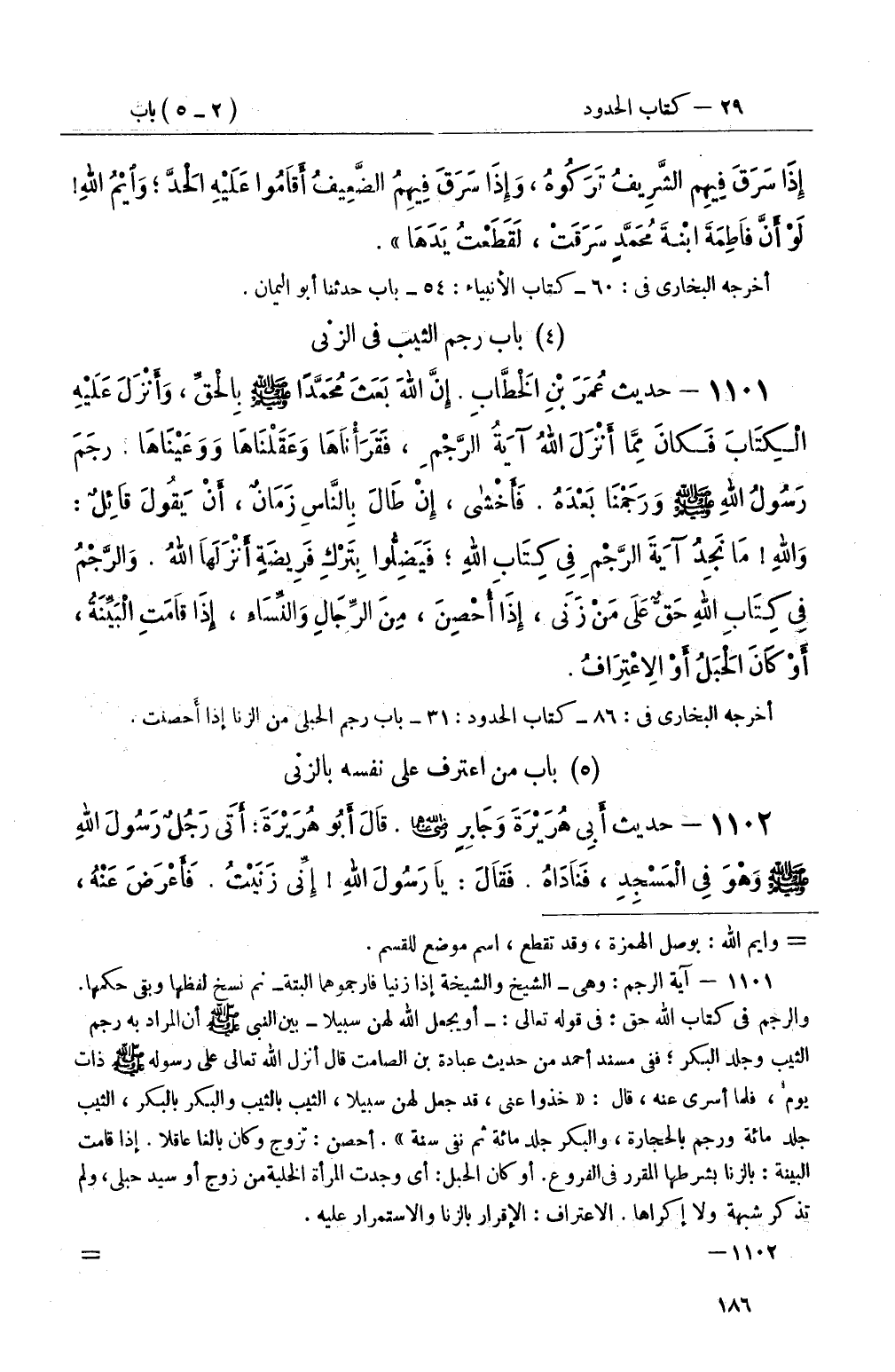 1101 - حديث عُمَرَ بْنِ الْخَطَّابِ إِنَّ اللهَ بَعَثَ مُحَمَّدًا صَلَّى اللَّهُ عَلَيْهِ وَسَلَّمَ بِالْحَقِّ، وَأَنْزَلَ عَلَيْهِ الْكِتَابَ فَكَانَ مِمَّا أَنْزَلَ اللهُ آيَةُ الرَّجْمِ، فَقَرَأْنَاهَا وَعَقَلْنَاهَا وَوَعَيْنَاهَا رَجَمَ رَسُولُ اللهِ صَلَّى اللَّهُ عَلَيْهِ وَسَلَّمَ وَرَجَمْنَا بَعْدَهُ فَأَخْشى، إِنْ طَالَ بِالنَّاسِ زَمَانٌ، أَنْ يَقُولَ قَائِلٌ: وَاللهِ مَا نَجِدُ آيَةَ الرَّجْمِ فِي كِتَابِ اللهِ؛ فَيَضِلُّوا بِتَرْكِ فَرِيضَةٍ أَنْزَلَهَا اللهُ وَالرَّجْمُ فِي كِتَابِ اللهِ حَقٌّ عَلَى مَنْ زَنَى، إِذَا أُحْصِنَ، مِنَ الرِّجَالِ وَالنِّسَاءِ، إِذَا قَامَتِ الْبَيِّنَةُ، أَوْ كَانَ الْحَبَلُ أَوِ الاعْتِرَافُ