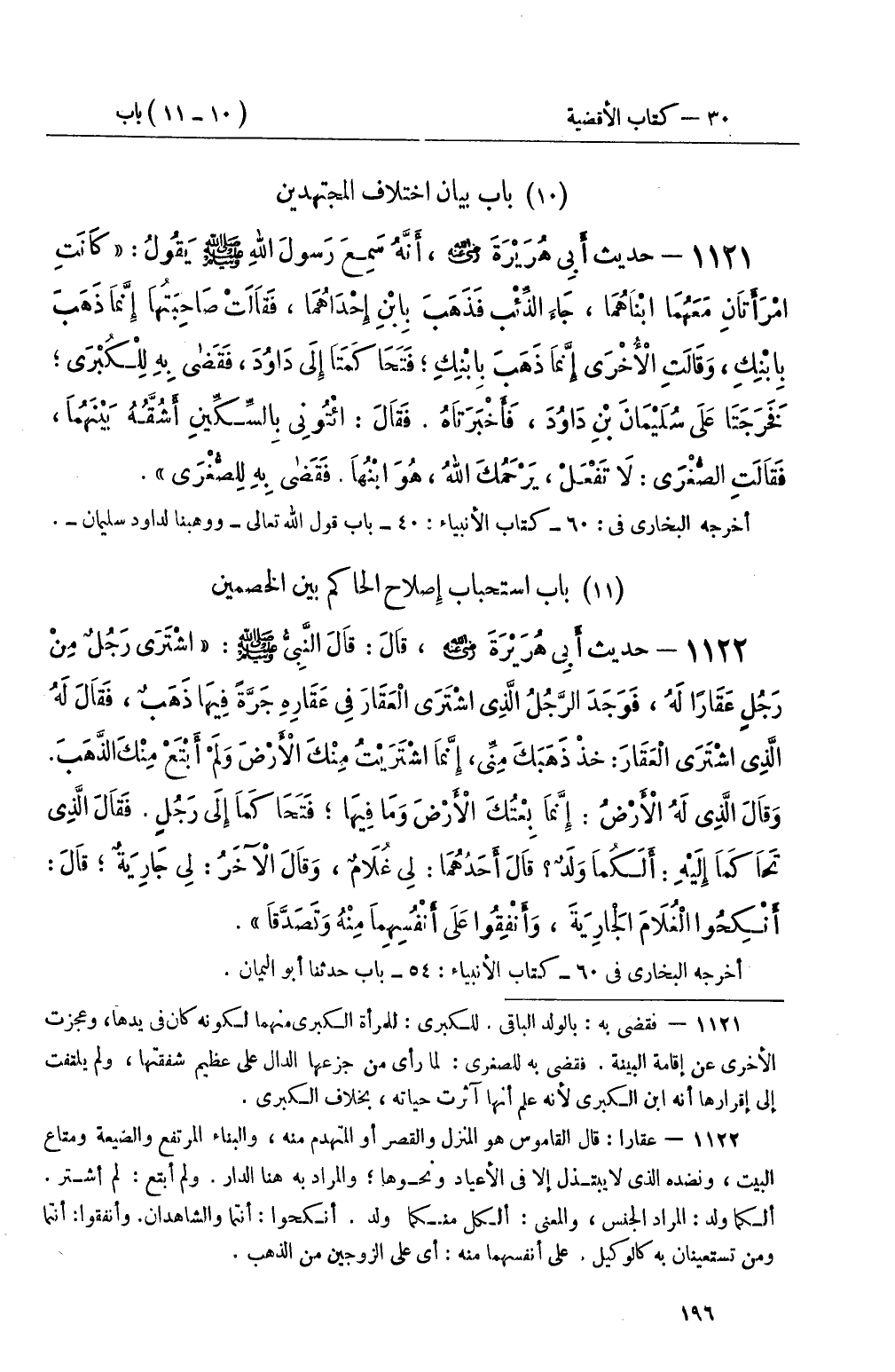 1121 - حديث أَبِي هُرَيْرَةَ رضي الله عنه، أَنَّهُ سَمِعَ رَسُولَ اللهِ صَلَّى اللَّهُ عَلَيْهِ وَسَلَّمَ يَقُولُ: كَانَتِ امْرَأَتَانِ مَعَهُمَا ابْنَاهُمَا، جَاءَ الذِّئْب فَذَهَبَ بِابْنِ إِحْدَاهُمَا، فَقَالَتْ صَاحِبَتُهَا إِنَّمَا ذَهَبَ بِابْنِكِ، وَقَالَتِ الأُخْرَى إِنَّمَا ذَهَبَ بِابْنِكِ؛ فَتَحَاكَمَتَا إِلَى دَاوُدَ، فَقَضى بِهِ لِلْكُبْرَى؛ فَخَرَجَتَا عَلَى سُلَيْمَانَ بْنِ دَاوُدَ، فَأَخْبَرَتَاهُ فَقَالَ: ائْتُونِي بِالسِّكِّينِ أَشُقُّهُ بَيْنَهُمَا، فَقَالَتِ الصُغْرَى: لاَ تَفْعَلْ، يَرْحَمُكَ اللهُ، هُوَ ابْنُهَا فَقَضى بِهِ لِلصُّغْرَى