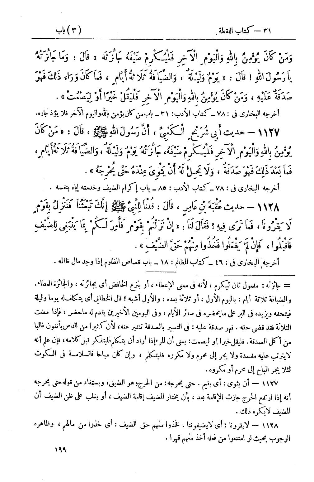 1127 - حديث أَبِي شُرَيْحٍ الْكَعْبِيِّ، أَنَّ رَسُولَ اللهِ صَلَّى اللَّهُ عَلَيْهِ وَسَلَّمَ، قَالَ: مَنْ كَانَ يُؤْمِنُ بِاللهِ وَالْيَوْمِ الآخِرِ فَلْيُكْرِمْ ضَيْفَهُ، جَائِزَتُهُ يَوْمٌ وَلَيْلَةٌ، وَالضِّيَافَةُ ثَلاَثَةُ أَيَّامٍ، فَمَا بَعْدَ ذَلِكَ فَهُوَ صَدَقَةٌ، وَلاَ يَحِلُّ لَهُ أَنْ يَثْوِيَ عِنْدَهُ حَتَّى يُحْرِجَهُ