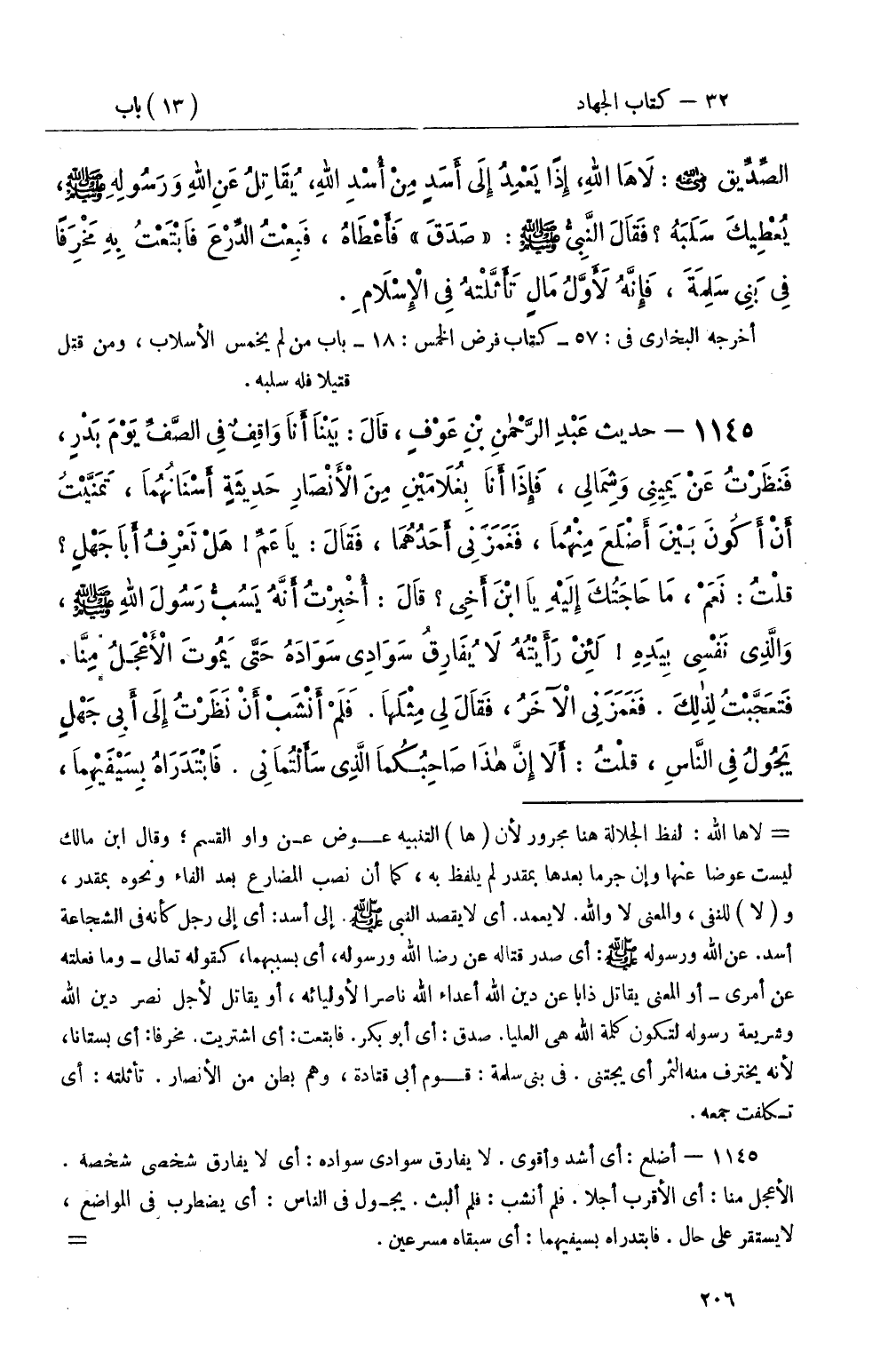 1145 - حديث عَبْدِ الرَّحْمنِ بْنِ عَوْفٍ، قَالَ: بَيْنَا أَنَا وَاقِفٌ فِي الصَّفِّ يَوْمَ بَدْرٍ، فَنظَرْتُ عَنْ يَمِينِي وَشِمَالِي، فَإِذَا أَنَا بِغُلاَمَيْنِ مِنَ الأَنْصَارِ حَدِيثَةٍ أَسْنَانُهُمَا، تَمَنَّيْتُ أَنْ أَكُونَ بَيْنَ أَضْلَعَ مِنْهُمَا، فَغَمَزَنِي أَحَدُهُمَا، فَقَالَ: يَا عَمِّ هَلْ تَعْرِفُ أَبا جَهْلٍ قُلْتُ: نَعَمْ، مَا حَاجَتُكَ إِلَيْهِ يَا ابْنَ أَخِي قَالَ: أُخْبِرْتُ أَنَّهُ يَسُبُّ رَسُولَ اللهِ صَلَّى اللَّهُ عَلَيْهِ وَسَلَّمَ، وَالَّذِي نَفْسِي بِيَدِهِ لَئِنْ رَأَيْتُهُ لاَ يُفَارِقُ سَوَادِي سَوَادَهُ حَتَّى يَمُوتَ الأَعْجَلُ مِنَّا فَتَعَجَّبْتُ لِذلِكَ فَغَمَزَنِي الآخَرُ، فَقَالَ لِي مِثْلَهَا فَلَمْ أَنْشَبْ أَنْ نَظَرْتُ إِلَى أَبِي جَهْلٍ يَجُولُ فِي النَّاس، قلْتُ: أَلاَ إِنَّ هذَا صَاحِبُكُمَا الَّذِي سَأَلْتُمَانِي فَابْتَدَرَاهُ بِسَيْفِيْهِمَا، -[207]- فَضَرَبَاهُ حَتَّى قَتَلاَهُ، ثُمَّ انْصَرَفَا إِلَى رَسُولِ اللهِ صَلَّى اللَّهُ عَلَيْهِ وَسَلَّمَ، فَأَخْبَرَاهُ، فَقَالَ: أَيُّكُمَا قَتَلَهُ قَالَ كُلُّ وَاحِدٍ مِنْهُمَا: أَنَا قَتَلْتُهُ؛ فَقَالَ: هَلْ مَسَحْتُمَا سَيْفَيْكُمَا قَالاَ: لاَ فَنَظَرَ فِي السَّيْفَيْنِ، فَقَالَ: كِلاَكُمَا قَتَلَهُ، سَلَبُهُ لِمُعَاذٍ بْنِ عَمْرِو بْنِ الْجَمُوحِ وَكَانَا مُعَاذَ بْنَ عَفْرَاءَ، وَمُعَاذَ بْنَ عَمْرِو بْنِ الْجَمُوحِ