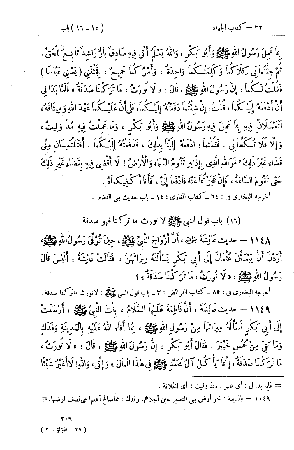 1149 - حديث عَائِشَةَ، أَنَّ فَاطِمَةَ عَلَيْهِا السَّلاَمُ، بِنْتَ النَّبِيِّ صَلَّى اللَّهُ عَلَيْهِ وَسَلَّمَ، أَرْسَلَتْ إِلَى أَبِي بَكْرٍ تَسْأَلُهُ مِيَراثَهَا مِنْ رَسُولِ اللهِ صَلَّى اللَّهُ عَلَيْهِ وَسَلَّمَ، مِمَّا أَفَاءَ اللهُ عَلَيْهِ بِالْمَدِينَةِ وَفَدَكٍ وَمَا بَقِيَ مِنْ خُمُسِ خَيْبَرَ فَقَالَ أَبُو بَكْرٍ: إِنَّ رَسُولَ اللهِ صَلَّى اللَّهُ عَلَيْهِ وَسَلَّمَ، قَالَ: لاَ نُورَثُ، مَا تَرَكْنَا صَدَقَةٌ، إِنَّمَا يَأْكُلُ آلُ مُحَمَّدٍ صَلَّى اللَّهُ عَلَيْهِ وَسَلَّمَ فِي هذَا الْمَالَ وَإِنِّي، وَاللهِ لاَ أُغَيِّرُ شَيْئًا -[210]- مِنْ صَدَقَةِ رَسُولِ اللهِ صَلَّى اللَّهُ عَلَيْهِ وَسَلَّمَ عَنْ حَالِهَا الَّتِي كَان عَلَيْهَا فِي عَهْدِ رَسُولِ اللهِ صَلَّى اللَّهُ عَلَيْهِ وَسَلَّمَ، وَلأَعْمَلَنَّ فِيهَا بِمَا عَمِلَ بِهِ رَسُولُ اللهِ صَلَّى اللَّهُ عَلَيْهِ وَسَلَّمَ فَأَبى أَبُو بَكْرٍ أَنْ يَدْفَعَ إِلَى فَاطِمَةَ مِنْهَا شَيْئًا فَوَجَدَتْ فَاطِمَةُ عَلَى أَبِي بَكْرٍ فِي ذَلِكَ، فَهَجَرَتْهُ، فَلَمْ تُكَلِّمْهُ حَتَّى تُوُفِّيَتْ وَعَاشَتْ بَعْدَ النَّبِيِّ صَلَّى اللَّهُ عَلَيْهِ وَسَلَّمَ سِتَّةَ أَشْهُرٍ، فَلَمَّا تُوُفِّيَتْ دَفَنَهَا زَوْجُهَا عَلِيٌّ لَيْلاً، وَلَمْ يُؤْذِنْ بِهَا أَبَا بَكْرٍ، وَصَلَّى عَلَيْهَا وَكَانَ لِعَلِيٍّ مِنَ النَّاسِ وَجْهٌ حَيَاةَ فَاطِمَةَ فَلَمَّا تُوُفِّيَتِ اسْتَنْكَرَ عَلِيٌّ وُجُوهَ النَّاسِ، فَالْتَمَسَ مُصَالَحَةَ أَبِي بَكْرٍ وَمُبَايَعَتَهُ، وَلَمْ يَكُنْ يُبَايِعُ تِلْكَ الأَشْهُرَ فَأَرْسَلَ إِلَى أَبِي بَكْرٍ: أَنِ ائْتِنَا، وَلاَ يَأْتِنَا أَحَدٌ مَعَكَ (كَرَاهِيَةً لِمَحْضَرِ عُمَرَ) فَقَالَ عُمَرُ: لاَ، وَاللهِ لاَ تَدْخُلُ عَلَيْهِمْ وَحْدَكَ فَقَالَ أَبُو بَكْرٍ: وَمَا عَسِيْتَهُمْ أَنْ يَفْعَلُوا بِي وَاللهِ لآتِيَنَّهُمْ فَدَخَلَ عَلَيْهِمْ أَبُو بَكْرٍ، فَتَشَهَّدَ