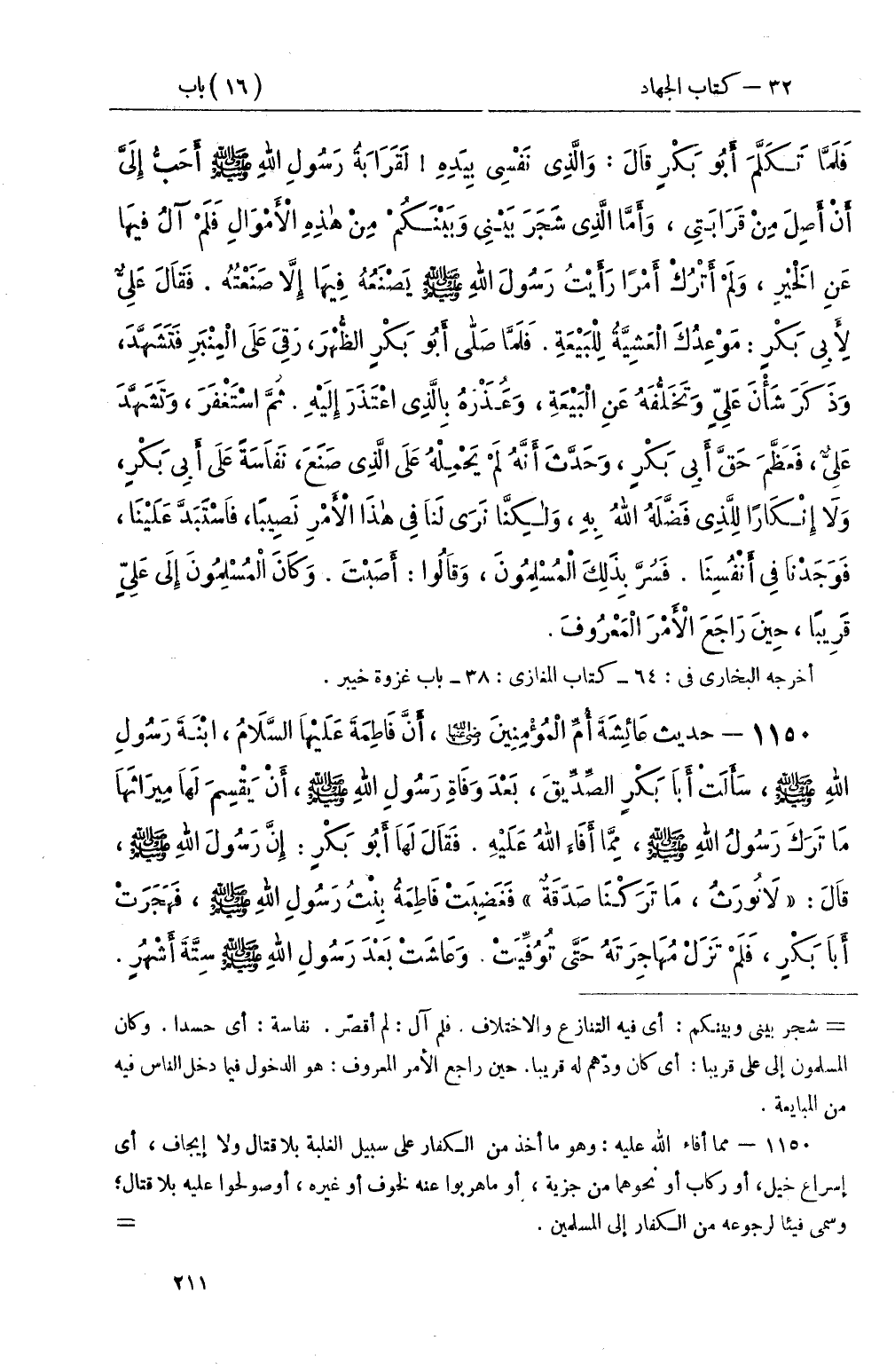1150 - حديث عَائِشَةَ أُمِّ الْمُؤْمِنِينَ، أَنَّ فَاطِمَةَ عَلَيْهَا السَّلاَمُ، ابْنَةَ رَسُولِ اللهِ صَلَّى اللَّهُ عَلَيْهِ وَسَلَّمَ، سَأَلَتْ أَبَا بَكْرٍ الصِّدِّيقَ، بَعْدَ وَفَاةِ رَسُولِ اللهِ صَلَّى اللَّهُ عَلَيْهِ وَسَلَّمَ، أَنْ يَقْسِمَ لَهَا مِيرَاثَهَا مَا تَرَكَ رَسُولُ اللهِ صَلَّى اللَّهُ عَلَيْهِ وَسَلَّمَ، مِمَّا أَفَاءَ اللهُ عَلَيْهِ فَقَالَ لَهَا أَبُو بَكْرٍ: إِنَّ رَسُولَ اللهِ صَلَّى اللَّهُ عَلَيْهِ وَسَلَّمَ، قَالَ: لاَ نُورَثُ، مَا تَرَكْنَا صَدَقَةٌ فَغَضِبَتْ فَاطِمَةُ بِنْتُ رَسُولِ اللهِ صَلَّى اللَّهُ عَلَيْهِ وَسَلَّمَ، فَهَجَرَتْ أَبَا بَكْرٍ، فَلَمْ تَزَلْ مُهَاجِرَتَهُ حَتَّى تُوُفِّيَتْ وَعَاشَتْ بَعْدَ رَسُولِ اللهِ صَلَّى اللَّهُ عَلَيْهِ وَسَلَّمَ سِتَّةَ أَشْهُرٍ -[212]- قَالَتْ: وَكَانَتْ فَاطِمَةُ تَسْأَلُ أَبَا بَكْرٍ نَصِيبَهَا مِمَّا تَرَكَ رَسُولُ اللهِ صَلَّى اللَّهُ عَلَيْهِ وَسَلَّمَ مِنْ خَيْبَرَ وَفَدَكٍ، وَصَدَقَتِهِ ُ بَالْمَدِينَةِ فَأَبى أَبُو بَكْرٍ عَلَيْهَا ذَلِكَ وَقَالَ: لَسْتُ تَارِكًا شَيْئًا كَانَ رَسُولُ اللهِ صَلَّى اللَّهُ عَلَيْهِ وَسَلَّمَ يَعْمَلُ بِهِ إِلاَّ عَمِلْتُ بِهِ، فَإِنِّي أَخْشى، إِنْ تَرَكْتُ شَيْئًا مِنْ أَمْرِهِ، أَنْ أَزِيغَ فَأَمَّا صَدَقَتُهُ بِالْمَدِينَةِ فَدَفَعَهَا عُمَرُ إِلَى عَلِيٍّ وَعَبَّاسٍ فَأَمَّا خَيْبَرُ وَفَدَكٌ فَأَمْسَكَهَا عُمَرُ، وَقَالَ: هُمَا صَدَقَةُ رَسُولِ اللهِ كَانتَا لِحُقُوقِهِ الَّتِي تَعْرُوهُ وَنَوَائِبِهِ، وَأَمْرُهُمَا إِلَى مَنْ وَلِيَ الأَمْرَ فَهُمَا عَلَى ذلِكَ إِلَى الْيَوْمِ