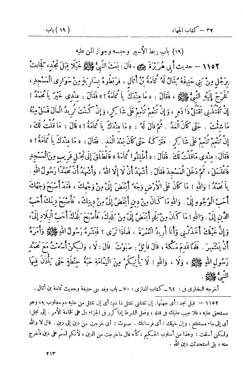 1152 - حديث أَبِي هُرَيْرَةَ رضي الله عنه، قَالَ: بَعَثَ النَّبِيُّ صَلَّى اللَّهُ عَلَيْهِ وَسَلَّمَ خَيْلاً قِبَلَ نَجْدٍ، فَجَاءَتْ بِرَجُلٍ مِنْ بَنِي حَنِيفَةَ يُقَالُ لَهُ ثُمَامَةُ بْنُ أُثَالٍ، فَرَبَطُوهُ بِسَارِيَةٍ مِنْ سَوَارِي الْمَسْجِدِ، فَخَرَجَ إِلَيْهِ النَّبِيُّ صَلَّى اللَّهُ عَلَيْهِ وَسَلَّمَ، فَقَالَ: مَا عِنْدَكَ يَا ثُمَامَةُ فَقَالَ: عِنْدِي خَيْرٌ يَا مُحَمَّدُ إِنْ تَقْتُلْنِي تَقْتُلْ ذَا دَمٍ، وَإِنْ تُنْعِمْ تُنْعِمْ عَلَى شاكِرٍ، وَإِنْ كُنْتَ تُرِيدُ الْمَالَ فَسَلْ مِنْهُ مَا شِئْتَ حَتَّى كَانَ الْغَدُ ثُمَّ قَالَ لَهُ: مَا عِنْدَكَ يَا ثُمَامَةُ قَالَ: مَا قُلْتُ لَكَ، إِنْ تُنْعِمْ تُنْعِمْ عَلَى شَاكِرٍ فَتَرَكَهُ حَتَّى كَانَ بَعْدَ الْغَدِ فَقَالَ: مَا عِنْدَكَ يَا ثُمَامَةُ فَقَالَ عِنْدِي مَا قُلْتُ لَكَ فَقَالَ: أَطْلِقُوا ثُمَامَةَ فَانْطَلَقَ إِلَى نَجْلٍ قَرِيبٍ مِنَ الْمَسْجِدِ فَاغْتَسَلَ، ثُمَّ دَخَلَ الْمَسْجِدَ فَقَالَ: أَشْهَدُ أَنْ لاَ إِله إِلاَّ اللهُ، وَأَشْهَدُ أَنَّ مُحَمَّدًا رَسُولُ اللهِ يَا