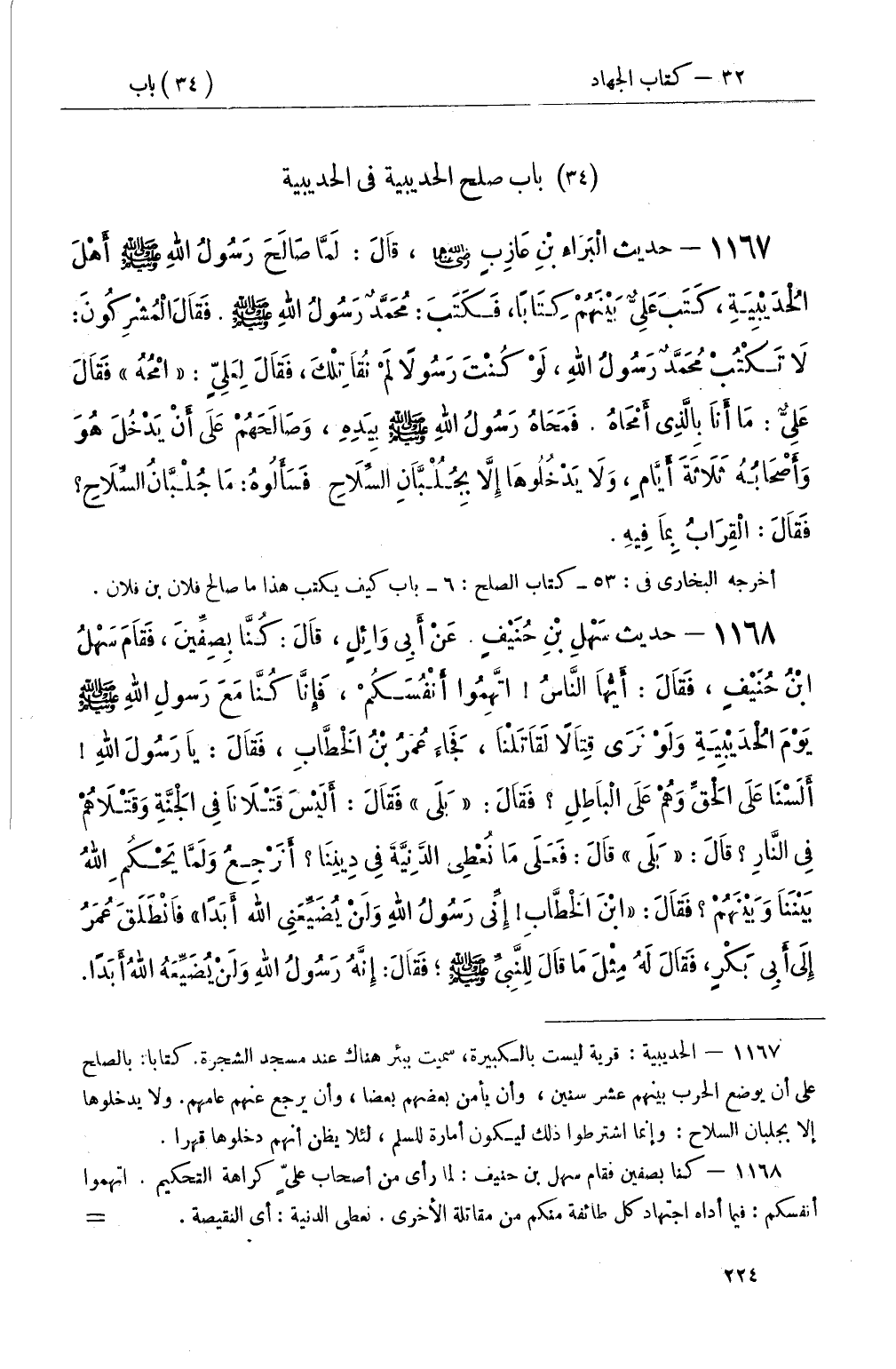 1168 - حديث سَهْلِ بْنِ حُنَيْفٍ عَنْ أَبِي وَائِلٍ، قَالَ: كُنَّا بِصِفِّينَ، فَقَامَ سَهْلُ بْنُ حُنَيْفٍ، فَقَالَ: أَيُّهَا النَّاسُ اتَّهِمُوا أَنْفُسَكُمْ، فَإِنَّا كُنَّا مَعَ رَسُولِ اللهِ صَلَّى اللَّهُ عَلَيْهِ وَسَلَّمَ يَوْمَ الحُدَيْبِيَةِ وَلَوْ نَرَى قِتَالاً لَقَاتَلْنَا، فَجَاءَ عُمَرُ بْنُ الْخَطَّابِ، فَقَالَ: يَا رَسُولَ اللهِ أَلَسْنَا عَلَى الْحَقِّ وَهُمْ عَلَى الْبَاطِلِ فَقَالَ: بَلَى فَقَالَ: أَلَيْسَ قَتْلاَنَا فِي الْجَنَّةِ وَقَتْلاَهُمْ فِي النَّارِ قَالَ: بَلَى قَالَ: فَعَلَى مَا نُعْطِي الدَّنِيَّةَ فِي دِينِنَا أَنَرْجِعُ وَلَمَّا يَحْكُمِ اللهُ بَيْنَنَا وَبَيْنَهُمْ فَقَالَ: ابْنَ الْخطَّابِ إِنِّي رَسُولُ اللهِ وَلَنْ يُضَيِّعَنِي الله أَبَدًا فَانْطَلَقَ عُمَرُ إِلَى أَبِي بَكْرٍ، فَقَالَ لَهُ مِثْلَ مَا قَالَ لِلنَّبِيِّ صَلَّى اللَّهُ عَلَيْهِ وَسَلَّمَ؛ فَقَالَ: إِنَّهُ رَسُولُ اللهِ وَلَنْ يُضَيِّعَهُ اللهُ أَبَدًا -[225]- فَنَزَلَتْ سُورَةُ الْفَتْحِ، فَقَرَأَهَا رَسُولُ اللهِ صَلَّى اللَّهُ عَلَيْهِ وَسَلَّمَ عَلَى عُمَرَ إِلَى آخِرِهَا فَقَالَ عُمَرُ: يَا رَسُولَ اللهِ أَو فَتْحٌ هُوَ قَالَ: نَعَمْ