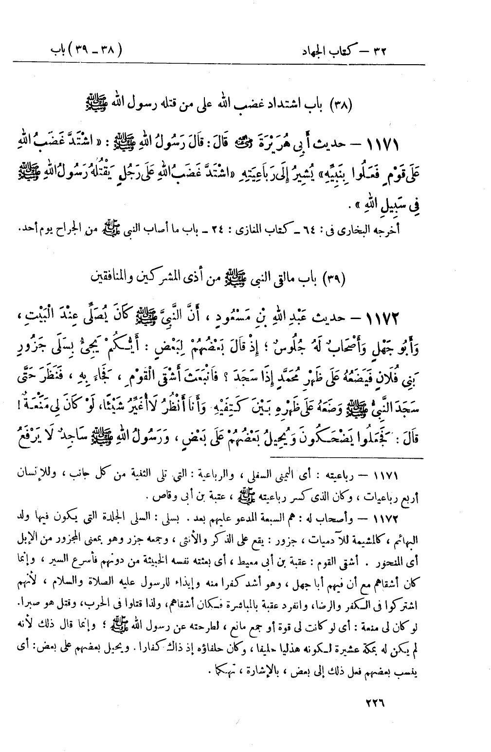 1172 - حديث عَبْدِ اللهِ بْنِ مَسْعُودٍ، أَنَّ النَبِيَّ صَلَّى اللَّهُ عَلَيْهِ وَسَلَّمَ كَانَ يُصَلِّي عِنْدَ الْبَيْتِ، وَأَبُو جَهْلٍ وَأَصْحَابٌ لَهُ جُلُوسٌ؛ إِذْ قَالَ بَعْضُهُمْ لِبَعْضٍ: أَيُّكُمْ يَجِىءُ بِسَلَى جَزُورِ بَنِي فُلاَنٍ فَيَضَعُهُ عَلَى ظَهْرِ مُحَمَّدٍ إِذَا سَجَدَ فَانْبَعَثَ أَشْقَى الْقَوْمِ، فَجَاءَ بِهِ، فَنَظَرَ حَتَّى سَجَدَ النَّبِيُّ صَلَّى اللَّهُ عَلَيْهِ وَسَلَّمَ وَضَعَهُ عَلَى ظَهْرِهِ بَيْنَ كَتِفَيْهِ وَأَنَا أَنْظُرُ لاَ أُغَيِّرُ شَيْئًا، لَوْ كَانَ لِي مَنَعَةٌ قَالَ: فَجَعَلُوا يَضْحَكُونَ وَيُحِيلُ بَعْضُهُمْ عَلَى بَعْضٍ، وَرَسُولُ اللهِ صَلَّى اللَّهُ عَلَيْهِ وَسَلَّمَ سَاجِدٌ لاَ يَرْفَعُ -[227]- رأْسَهُ حَتَّى جَاءَتهُ فَاطِمَةُ، فَطَرَحَتْ عَنْ ظَهْرِهِ، فَرَفَعَ رَأْسَهُ ثُمَّ قَالَ: اللهُمَّ عَلَيْكَ بِقُرَيْشٍ ثَلاَثَ مَرَّاتٍ فَشَقَّ عَلَيْهِمْ إِذْ دَعَا عَلَيْهِمْ قَالَ: وَكَانُوا يُرَوْنَ أَنَّ الدَّعْوَةَ فِي ذَلِكَ الْبَلَدِ مُسْتَجَابَةٌ ثُمَّ سَمَّى: اللهُمَّ عَلَيْكَ بِأَبِي جَهْلٍ، وَعَلَيْكَ بِعُتْبَةَ بْنِ رَبِيعَةَ، وَشَيْبَةَ بْنِ رَبِيعَةَ، وَالْوَلِيدِ بْنِ عُتْبَةَ، وَأُمَيَّةَ بْنِ خَلَفٍ، وَعُقْبَةَ بْنَ أَبِي مُعَيْطٍ وَعَدَّ السَّابِعَ فَلَمْ يَحْفَظْهُ قَالَ: فَوَالَّذِي نَفْسِي بِيَدِهِ لَقَدْ رَأَيْتُ الَّذِين عَدَّ رَسُولُ اللهِ صَلَّى اللَّهُ عَلَيْهِ وَسَلَّمَ صَرْعَى فِي الْقَلِيبِ، قَلِيبِ بَدْرٍ
