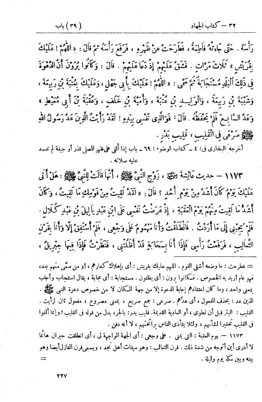 1173 - حديث عَائِشَةَ، زَوْجِ النَبِيِّ صَلَّى اللَّهُ عَلَيْهِ وَسَلَّمَ، أَنَّهَا قَالَتْ لِلنَّبِيِّ صَلَّى اللَّهُ عَلَيْهِ وَسَلَّمَ: هَلْ أَتَى عَلَيْكَ يَوْمٌ كَانَ أَشَدَّ مِنْ يَوْمِ أُحُدٍ قَالَ: لَقَدْ لَقِيتُ مِنْ قَوْمِكِ مَا لَقِيتُ، وَكَانَ أَشَدُّ مَا لَقِيتُ مِنْهُمْ يَوْمَ الْعَقَبَةِ، إِذْ عَرَضْتُ نَفْسِي عَلَى ابْنِ عَبْدِ يَالِيلَ بْنِ عَبْدِ كُلاَلٍ فَلَمْ يُجِبْنِي إِلَى مَا أَرَدْتُ فَانْطَلَقْتُ وَأَنَا مَهْمُومٌ عَلَى وَجْهِي، فَلَمْ أَسْتَفِقْ إِلاَّ وَأَنَا بِقَرْنِ الثَّعَالِبِ، فَرَفَعْتُ رَأْسِي فَإِذَا أَنَا بِسَحَابَةٍ قَدْ أَظَلَّتْنِي، فَنَظَرْتُ فَإِذَا فِيهَا جِبْرِيلُ، -[228]- فَنَادَانِي فَقَالَ: إِنَّ اللهَ قَدْ سَمِعَ قَوْلَ قَوْمِكَ لَكَ وَمَا رَدُّوا عَلَيْكَ، وَقَدْ بَعَثَ إِلَيْكَ مَلَكَ الْجِبَالِ لِتَأْمُرَهُ بِمَا شِئْتَ فِيهِمْ فَنَادَانِي مَلَكُ الْجِبَالِ فَسَلَّمَ عَلَيَّ، ثُمَّ قَالَ: يَا مُحَمَّدُ فَقَالَ ذَلِكَ فِيمَا شِئْتَ إِنْ أُطَبِّقَ عَلَيْهِمُ الأَخْشَبَيْنِ؛ فَقَالَ النَّبِيُّ صَلَّى اللَّهُ عَلَيْهِ وَسَلَّمَ: بَلْ أَرْجُو أَنْ يُخْرِجَ اللهُ مِنْ أَصْلاَبِهِمْ مَنْ يَعْبُدُ اللهَ وَحْدَهُ، لاَ يُشْرِكُ بِهِ شَيْئًا