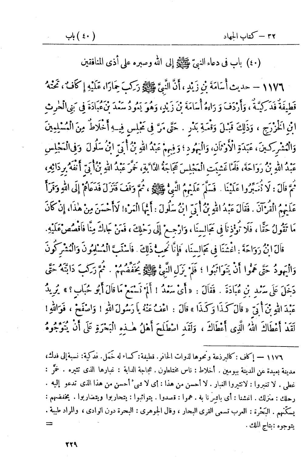 1176 - حديث أُسَامَةَ بْنِ زَيْدٍ، أَنَّ النَّبِيَّ صَلَّى اللَّهُ عَلَيْهِ وَسَلَّمَ رَكِبَ حِمارًا، عَلَيْهِ إِكَافٌ، تَحْتهُ قَطِيفَةٌ فَدَكِيَّةٌ، وَأَرْدَفَ وَرَاءَهُ أُسَامَةَ بْنَ زَيْدٍ، وَهُوَ يَعُودُ سَعْدَ بْنَ عُبَادَةَ فِي بَنِي الْحارث بْنِ الْخَزْرَجِ، وَذَلِكَ قَبْلَ وَقْعَةِ بَدْرٍ حَتَّى مَرَّ فِي مَجْلِسٍ فِيهِ أَخْلاَطٌ مِنَ الْمُسْلِمِينَ وَالْمُشْرِكِينَ، عَبَدَةِ الأَوْثَانِ، وَالْيَهُودِ؛ وَفِيهِمْ عَبْدُ اللهِ بْنُ أُبَيٍّ بْنُ سَلُولَ وَفِي الْمَجْلِسِ عَبْدُ اللهِ بْنُ رَوَاحَةَ، فَلَمَّا غَشِيَتِ الْمَجْلِسَ عَجَاجَةُ الدَّابَّةِ، خَمَّرَ عَبْدُ اللهِ بْنُ أُبَيٍّ أَنْفَهُ بِرِدَائِهِ، ثُمَّ قَالَ: لاَ تُغَبِّرُوا عَلَيْنَا فَسَلَّمَ عَلَيْهِمُ النَّبِيُّ صَلَّى اللَّهُ عَلَيْهِ وَسَلَّمَ، ثُمَّ وَقَفَ فَنَزَلَ فَدَعَاهُمْ إِلَى اللهِ وَقَرَأَ عَلَيْهِمُ الْقُرْآنَ فَقَالَ عَبْدُ اللهِ بْنُ أُبَيٍّ بْنُ سَلُولَ: أَيُّهَا الْمَرْءُ لاَ أَحْسَنَ مِنْ هذَا، إِنْ كَانَ مَا تَقُولُ حَقًّا، فَلاَ تُؤْذِنَا فِي مَجَالِسِنَا، وَارْجِعْ إِلَى رَحْلِكَ، فَمَنْ جَاءَكَ مِنَّا فَاقْصُص عَلَيْه