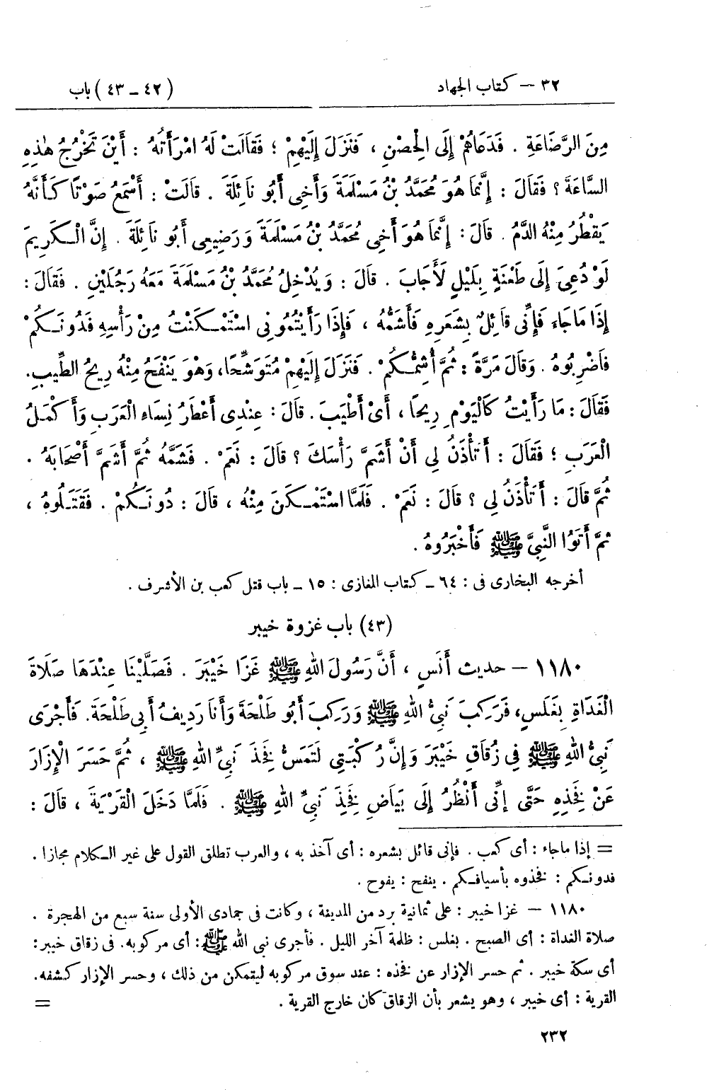1180 - حديث أَنَسٍ، أَنَّ رَسُولَ اللهِ صَلَّى اللَّهُ عَلَيْهِ وَسَلَّمَ غَزَا خَيْبَرَ فَصَلَّيْنَا عِنْدَهَا صَلاَةَ الْغَدَاةِ بِغَلَسٍ، فَرَكِبَ نَبِيُّ اللهِ صَلَّى اللَّهُ عَلَيْهِ وَسَلَّمَ وَرَكِبَ أَبُو طَلْحَةَ وَأَنَا رَدِيفُ أَبِي طَلْحَةَ فَأَجْرَى نَبِيُّ الله صَلَّى اللَّهُ عَلَيْهِ وَسَلَّمَ فِي زُقَاقِ خَيْبَرَ وَإِنَّ رُكْبَتِي لَتَمَسُّ فَخِذَ نَبِيِّ اللهِ صَلَّى اللَّهُ عَلَيْهِ وَسَلَّمَ، ثُمَّ حَسَرَ الإِزَارَ عَنْ فَخْذِهِ حَتَّى إِنِّي أَنْظُرُ إِلَى بَيَاضِ فَخِذَ نَبِيِّ اللهِ صَلَّى اللَّهُ عَلَيْهِ وَسَلَّمَ فَلَمَّا دَخَلَ الْقَرْيَةَ، قَالَ: -[233]- اللهُ أَكْبَرُ خَرِبَتْ خَيْبَرُ إِنَّا إِذَا نَزَلْنَا بِسَاحَةِ قَوْمٍ فَسَاءَ صَبَاحُ الْمُنْذَرِينَ قَالَهَا ثَلاَثًا قَالَ: وَخَرَجَ الْقَوْمُ إِلَى أَعْمَالِهِمْ، فَقَالُوا: مُحَمَّدٌ وَالْخَمِيسُ (يَعْنِي الْجَيْشَ) قَالَ: فَأَصَبْنَاهَا عَنْوَةً