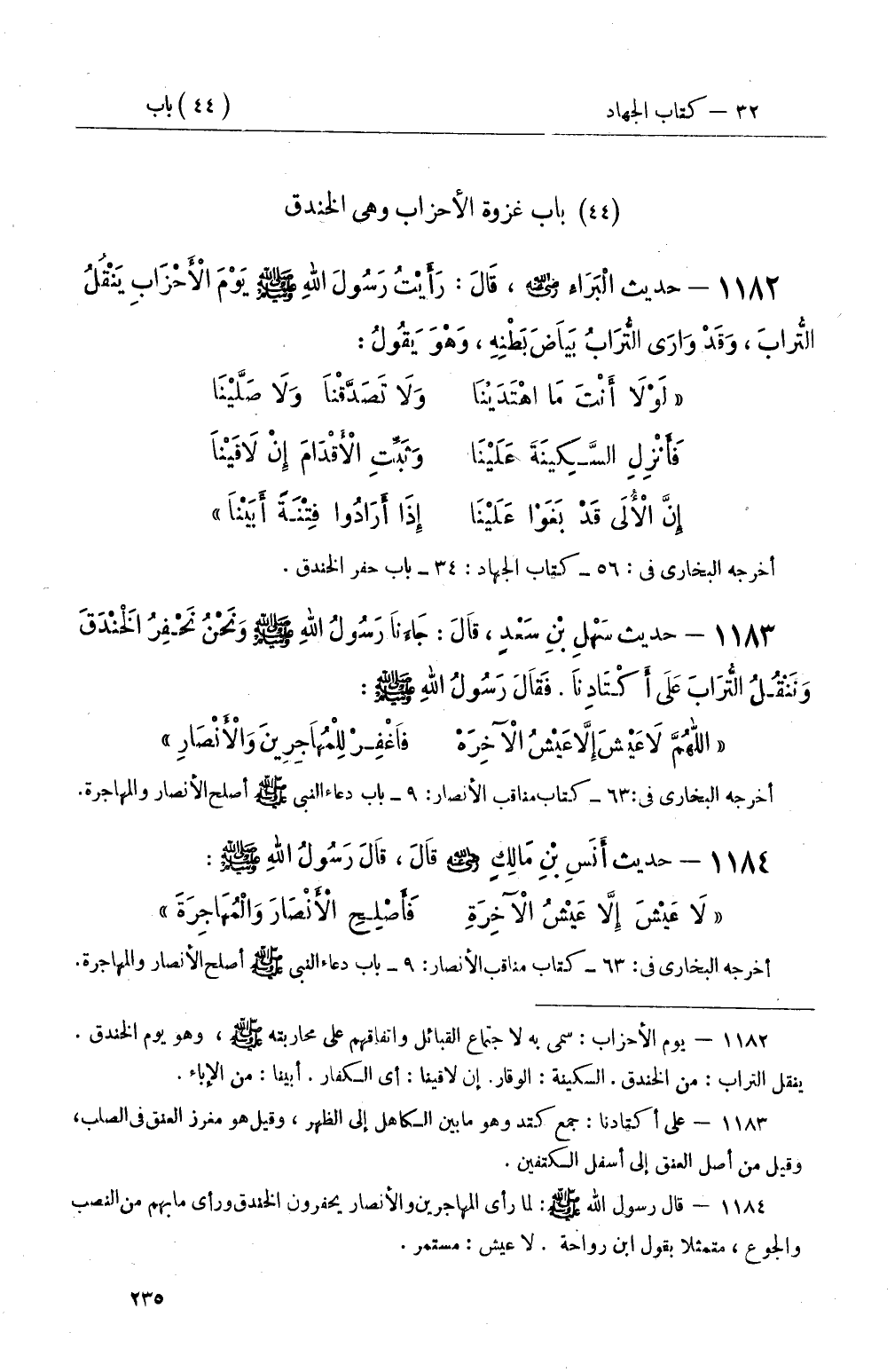 1182 - حديث الْبَرَاءِ رضي الله عنه، قَالَ: رَأَيْتُ رَسُولَ اللهِ صَلَّى اللَّهُ عَلَيْهِ وَسَلَّمَ يَوْمَ الأَحْزَابِ يَنْقُلُ التُّرابَ، وَقَد وَارَى التُّرَابُ بَيَاضَ بَطْنِهِ، وَهُوَ يَقُولُ: