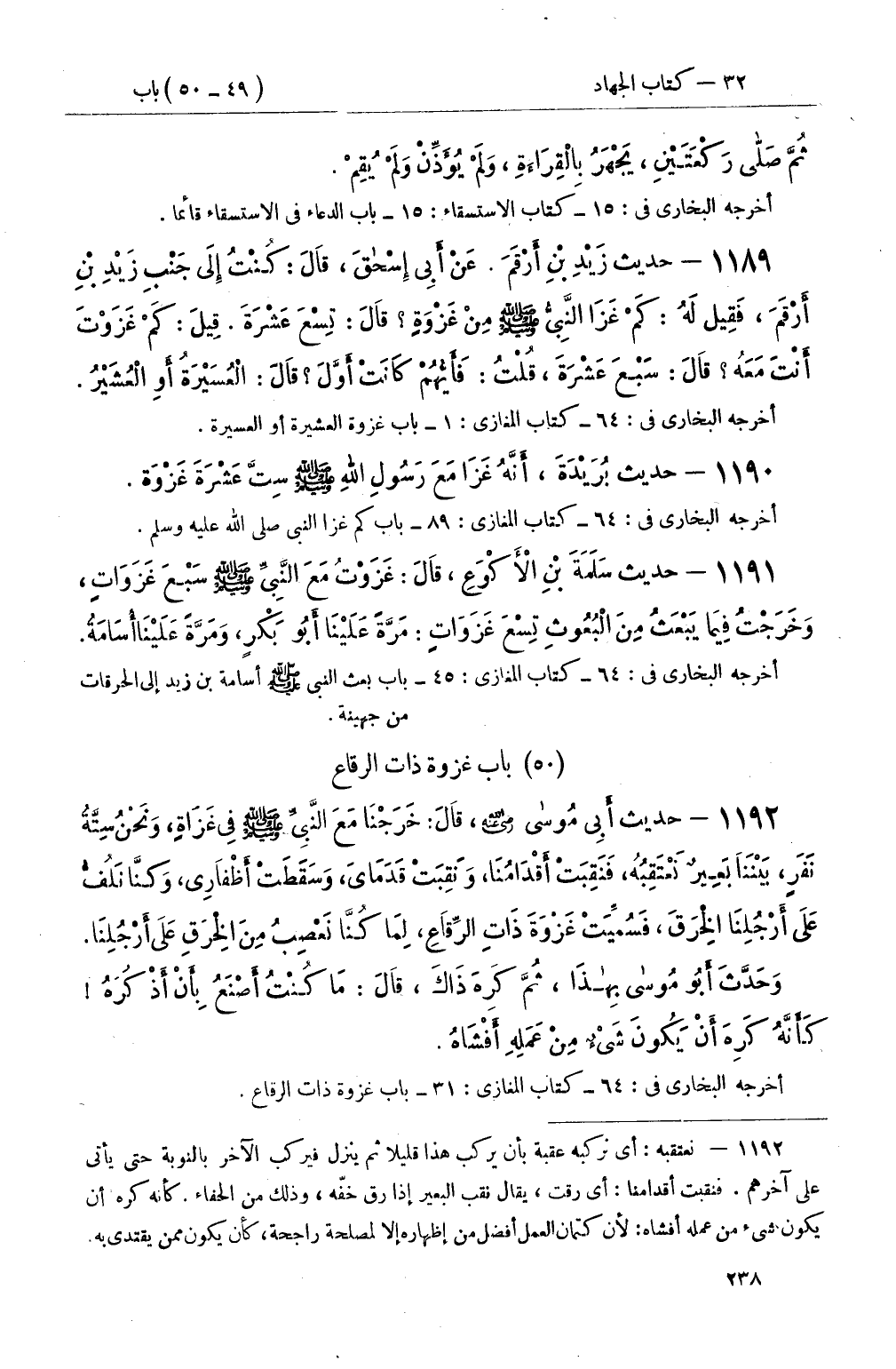 1189 - حديث زَيْدِ بْنِ أَرْقَمَ عَنْ أَبِي إِسْحقَ، قَالَ: كُنْتُ إِلَى جَنْبِ زَيْدِ بْنِ أَرْقَمَ، فَقِيلَ لَهُ: كَمْ غَزَا النَّبِيُّ صَلَّى اللَّهُ عَلَيْهِ وَسَلَّمَ مِنْ غَزْوَةٍ قَالَ: تِسْعَ عَشْرَةَ قِيلَ: كَمْ غَزَوْتَ أَنْتَ مَعَهُ قَالَ: سَبْعَ عَشْرَةَ، قُلْتُ: فَأَيُّهُمْ كَانَتْ أَوَّلَ قَالَ: الْعُسَيْرَةُ أَوِ الْعُشَيْرُ