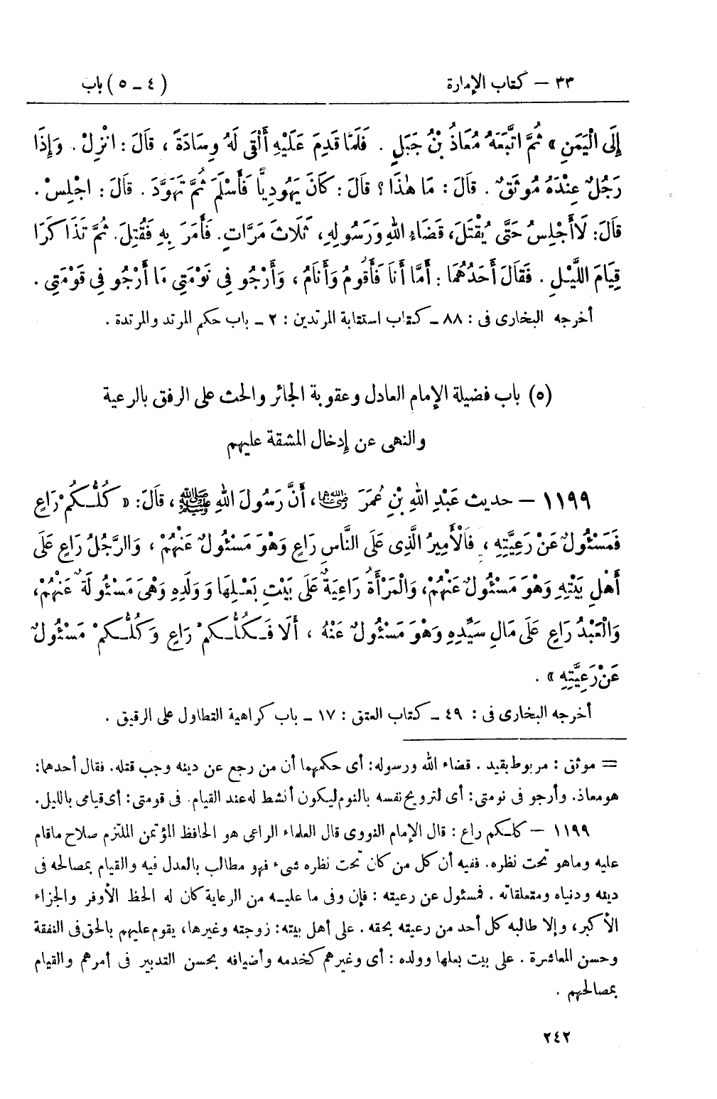 1199 - حديث عَبْدِ اللهِ بْنِ عُمَرَ، أَنَّ رَسُولَ اللهِ صَلَّى اللَّهُ عَلَيْهِ وَسَلَّمَ، قَالَ: كُلُّكُمْ رَاعٍ فَمَسْئُولٌ عَنْ رَعِيَّتِهِ، فَالأَمِيرُ الَّذِي عَلَى النَّاسِ رَاعٍ وَهُوَ مَسْئُولٌ عَنْهُمْ، وَالرَّجُلُ رَاعٍ عَلَى أَهْلِ بَيْتِهِ وَهُوَ مَسْئُولٌ عَنْهُمْ، وَالْمَرْأَةُ رَاعِيَةٌ عَلَى بَيْتِ بَعْلِهَا وَوَلَدِهِ وَهِيَ مَسْئُولَةٌ عَنْهُمْ، وَالْعَبْدُ رَاعٍ عَلَى مَالِ سَيِّدِهِ وَهُوَ مَسْئُولٌ عَنْهُ، أَلاَ فَكُلُّكمْ رَاعٍ وَكُلُّكمْ مَسْئُولٌ عَنْ رَعِيَّتِهِ