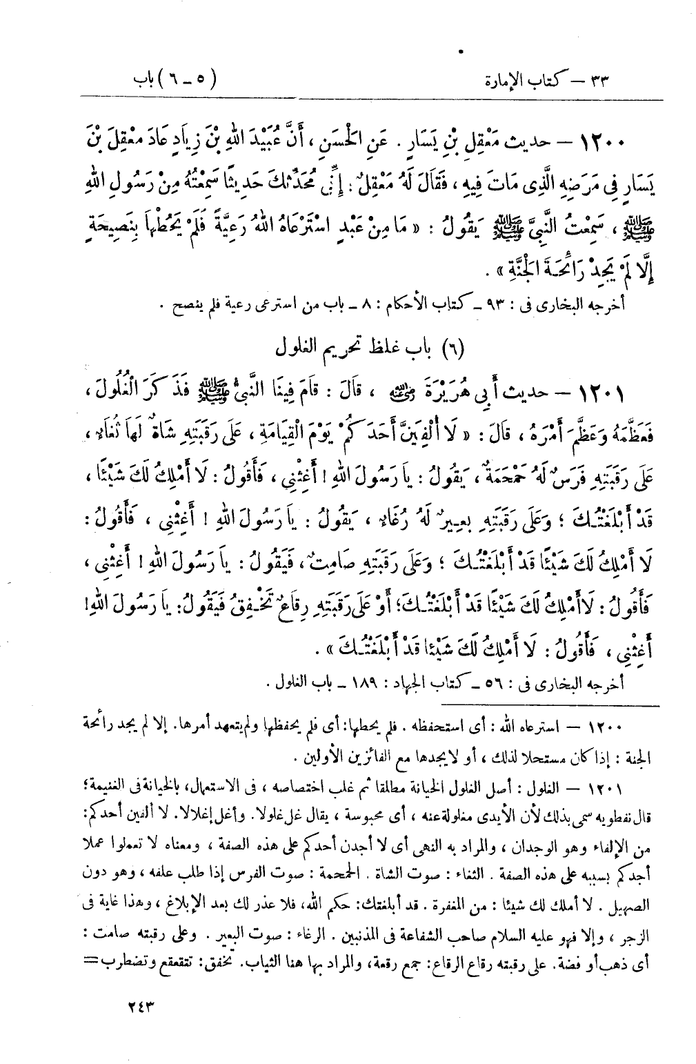1201 - حديث أَبِي هُرَيْرَةَ رضي الله عنه، قَالَ: قَامَ فِينَا النَّبِيُّ صَلَّى اللَّهُ عَلَيْهِ وَسَلَّمَ فَذَكَرَ الْغُلُولَ، فَعَظَّمَهُ وَعَظَّمَ أَمْرَهُ، قَالَ: لاَ أُلْفِيَنَّ أَحَدَكُمْ يَوْمَ الْقِيَامَةِ، عَلَى رَقَبَتِهِ شَاةٌ لَهَا ثُغَاءٌ، عَلَى رَقَبَتِهِ فَرَسٌ لَهُ حَمْحَمَةٌ، يَقُولُ: يَا رَسُولَ اللهِ أَغِثْنِي، فَأَقُولُ: لاَ أَمْلِكُ لَكَ شَيْئًا، قَدْ أَبْلَغْتُكَ؛ وَعَلَى رَقَبَتِهِ بعِيرٌ لَهُ رُغَاءٌ، يَقُولُ: يَا رَسُولَ اللهِ أَغثْنِي، فَأَقُولُ: لاَ أَمْلِكُ لَكَ شَيْئًا قَدْ أَبْلَغْتُكَ؛ وَعَلَى رَقَبَتِهِ صَامِتٌ، فَيَقُولُ: يَا رَسُولَ اللهِ أَغِثْنِي، فَأَقُولُ: لاَ أَمْلِكُ لَكَ شَيْئًا قَدْ أَبْلَغْتُكَ؛ أَوْ عَلَى رَقَبَتِهِ رِقَاعٌ تَخْفِقُ فَيَقُولُ: يَا رَسُولَ اللهِ أَغِثْنِي، فَأَقُولُ: لاَ أَمْلِكُ لَكَ شَيْئًا قَدْ أَبْلَغْتُكَ