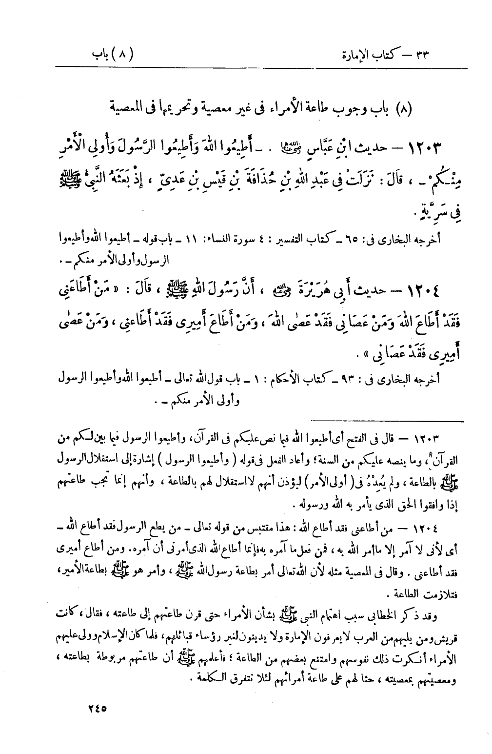 1203 - حديث ابْنِ عَبَّاسٍ (أَطِيعُوا اللهَ وَأَطِيعُوا الرَّسُولَ وَأُولى الأَمْرِ مِنْكُمْ) ، قَالَ: نَزَلَتْ فِي عَبْدِ اللهِ بْنِ حُذَافَةَ بْنِ قَيْسِ بْنِ عَدِيٍّ، إِذْ بَعَثَهُ النَّبِيُّ صَلَّى اللَّهُ عَلَيْهِ وَسَلَّمَ فِي سَرِيَّةٍ