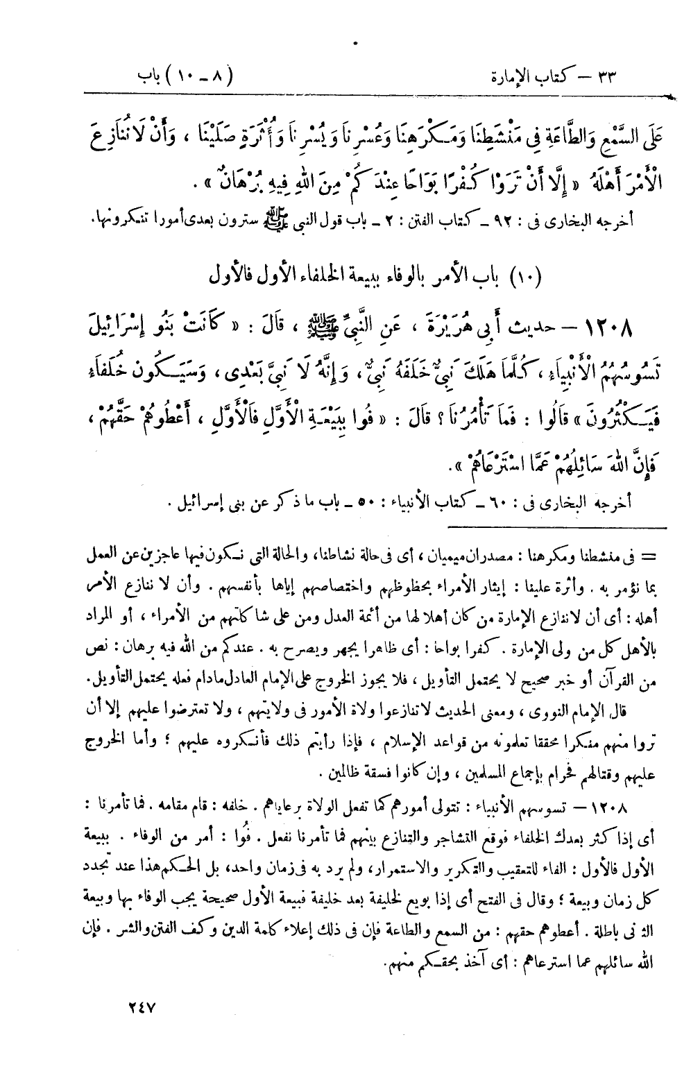 1208 - حديث أَبِي هُرَيْرَةَ، عَنِ النَّبِيِّ صَلَّى اللَّهُ عَلَيْهِ وَسَلَّمَ، قَالَ: كَانَتْ بَنُو إِسْرَائِيلَ تَسُوسُهُمُ الأَنْبِيَاءُ، كَلَّمَا هَلَكَ نَبِيٌّ خَلَفَهُ نَبِيٌّ، وَإِنَّهُ لاَ نَبِيَّ بَعْدِي، وَسَيَكُون خُلَفَاءُ فَيَكْثُرُونَ قَالُوا: فَمَا تَأْمُرُنَا قَالَ: فُوا بِبَيْعَةِ فَالأَوَّلِ، أَعْطُوهُمْ حَقَّهُمْ، فَإِنَّ اللهَ سَائِلُهُمْ عَمَّا اسْتَرْعَاهُمْ