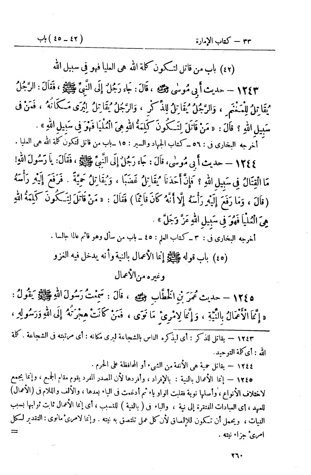 1245 - حديث عُمَرَ بْنِ الْخَطَّابِ رضي الله عنه، قَالَ: سَمِعْتُ رَسُولَ اللهِ صَلَّى اللَّهُ عَلَيْهِ وَسَلَّمَ يَقُولُ: إِنَّمَا الأَعْمَالُ بِالنِّيَّةِ، وَإِنَّمَا لاِمْرِى مَا نَوَى، فَمَنْ كَانَتْ هِجْرَتُهُ إِلَى اللهِ وَرَسُولِهِ، -[261]- فَهِجْرَتهُ إِلَى اللهِ وَرَسُولِهِ؛ وَمَنْ كَانَتْ هِجْرَتُهُ إِلَى دُنْيَا يُصِيبُهَا، أَوِ امْرَأَةٍ يَتَزَوَّجُهَا، فَهِجْرَتُهُ إِلَى مَا هَاجَرَ إِلَيْهِ