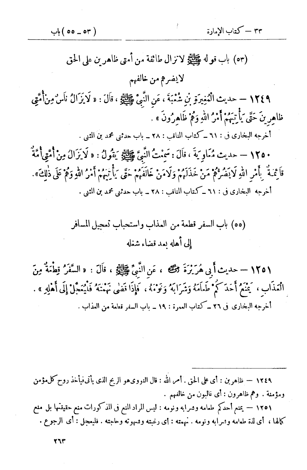 1251 - حديث أَبِي هُرَيْرَةَ رضي الله عنه، عَنِ النَّبِيِّ صَلَّى اللَّهُ عَلَيْهِ وَسَلَّمَ، قَالَ: السَّفَرُ قِطْعَةٌ مِنَ الْعَذَابِ، يَمْنَعُ أَحَدَكُمْ طَعَامَهُ وَشَرَابَهُ وَنَوْمَهُ، فَإِذَا قَضى نَهْمَتَهُ فَلْيُعَجِّلْ إِلَى أَهْلِهِ