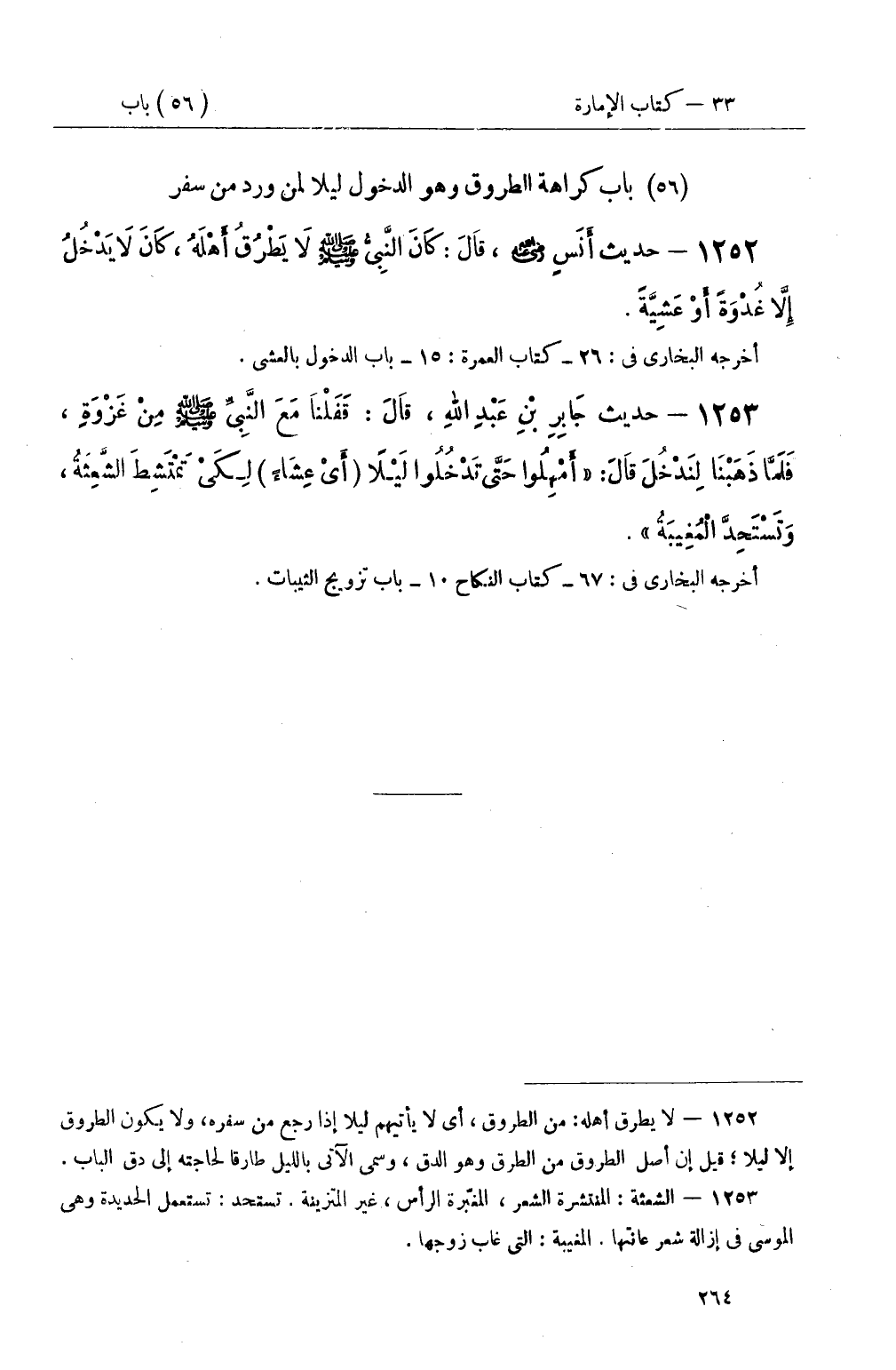 1252 - حديث أَنَسٍ رضي الله عنه، قَالَ: كَانَ النَّبِيُّ صَلَّى اللَّهُ عَلَيْهِ وَسَلَّمَ لاَ يَطْرُقُ أَهْلَهُ، كَانَ لاَ يَدْخلُ إِلاَّ غُدْوَةً أَوْ عَشِيَّةً