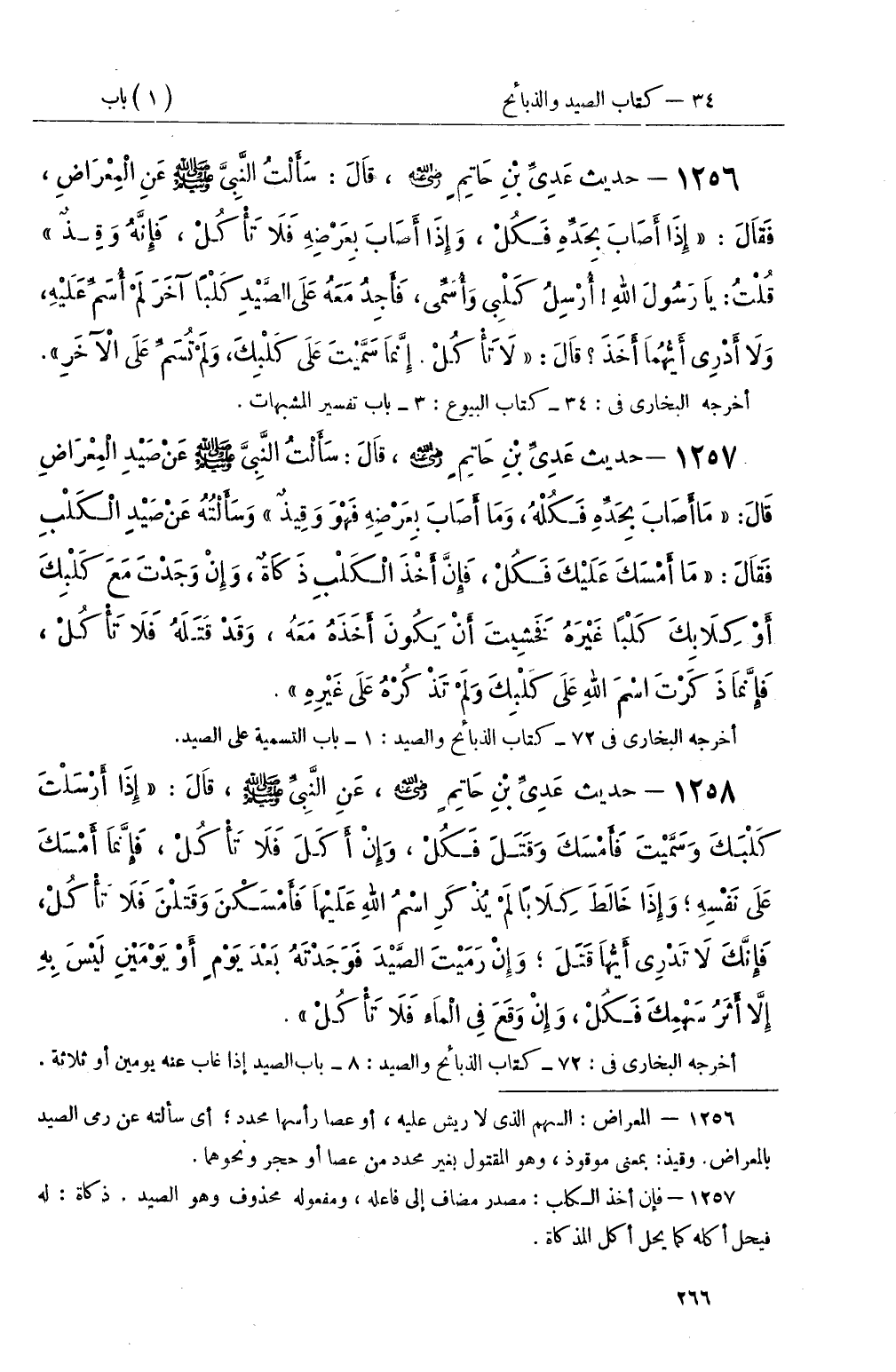 1257 - حديث عَدِيِّ بْنِ حَاتِمٍ رضي الله عنه، قَالَ: سَأَلْتُ النَّبِيَّ صَلَّى اللَّهُ عَلَيْهِ وَسَلَّمَ عَنْ صَيْدِ الْمِعْرَاضِ قَالَ: مَا أَصَابَ بِحَدِّهِ فَكُلْهُ، وَمَا أَصَابَ بِعَرْضِهِ فَهُوَ وَقِيذٌ وَسَأَلْتُهُ عَنْ صَيْدِ الْكَلْبِ فَقَالَ: مَا أَمْسَكَ عَلَيْكَ فَكُلْ، فَإِنَّ أَخْذَ الْكَلْبِ ذَكَاةٌ، وَإِنْ وَجَدْتَ مَعَ كَلْبِكَ أَوْ كِلاَبِكَ كَلْبًا غَيْرَهُ فَخَشِيتَ أَنْ يَكُونَ أَخَذَهُ مَعَهُ، وَقَدْ قَتَلَهُ فَلاَ تَأْكُلْ، فَإِنَّمَا ذَكَرْتَ اسْمَ اللهِ عَلَى كَلْبِكَ وَلَمْ تَذْكُرْهُ عَلَى غَيْرِهِ