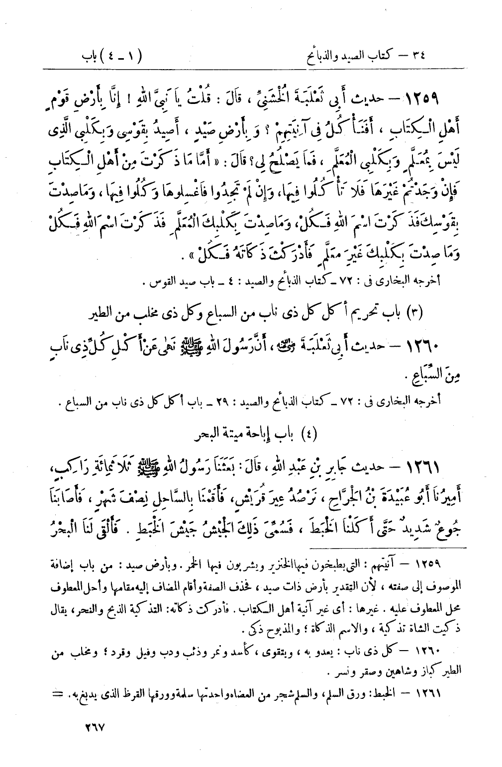 1259 - حديث أَبِي ثَعْلَبَةَ الْخُشَنِيِّ، قَالَ: قُلْتُ يَا نَبِيَّ اللهِ إِنَّا بِأَرْضِ قَوْمٍ أَهْلِ الْكِتَابِ، أَفَنَأْكُلُ فِي آنِيَتِهِمْ وَبِأَرْضِ صَيْدٍ، أَصِيدُ بِقَوْسِي وَبِكَلْبِي الَّذِي لَيْسَ بِمُعَلَّمٍ وَبِكَلْبِي الْمُعَلَّمِ، فَمَا يَصْلُحُ لِي قَالَ: أَمَّا مَا ذَكَرْتَ مِنْ أَهْلِ الْكِتَابِ فَإِنْ وَجَدْتُمْ غَيْرَهَا فَلاَ تَأْكُلُوا فِيهَا، وَإِنْ لَمْ تَجِدُوا فَاغْسِلوهَا وَكُلُوا فِيهَا، وَمَا صِدْتَ بِقَوْسِكَ فَذَكَرْتَ اسْمَ اللهِ فَكُلْ، وَمَا صِدْتَ بِكَلْبِكَ الْمُعَلَّمِ فَذَكَرْتَ اسْمَ اللهِ فَكُلْ وَمَا صِدْتَ بِكَلْبِكَ غَيْرَ مُعَلَّمٍ فَأَدْرَكْتَ ذَكَاتَهُ فَكُلْ