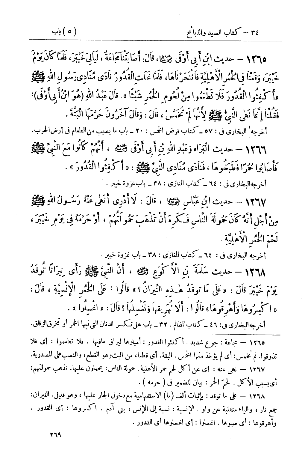 1265 - حديث ابْنِ أَبِي أَوْفَى، قَالَ: أَصَابَتْنَا مَجَاعَةٌ، لَيَالِيَ خَيْبَرَ، فَلَمَّا كَانَ يَوْمُ خَيْبَرَ، وَقَعْنَا فِي الْحُمُرِ الأَهْلِيَّةِ فَانْتَحَرْنَاهَا، فَلَمَّا غَلَتِ الْقُدُورُ نَادَى مُنَادِي رَسُولِ اللهِ صَلَّى اللَّهُ عَلَيْهِ وَسَلَّمَ أَكْفِئُوا الْقُدُورَ فَلاَ تَطْعَمُوا مِنْ لُحُومِ الْحُمُرِ شَيْئًا قَالَ عَبْدُ اللهِ (هُوَ ابْنُ أَبِي أَوْفَى) : فَقُلْنَا إِنَّمَا نَهى النَّبِيُّ صَلَّى اللَّهُ عَلَيْهِ وَسَلَّمَ لأَنَّهَا لَمْ تُخَمَّسْ، قَالَ: وَقَالَ آخَرُونَ حَرَّمَهَا الْبَتَّةَ