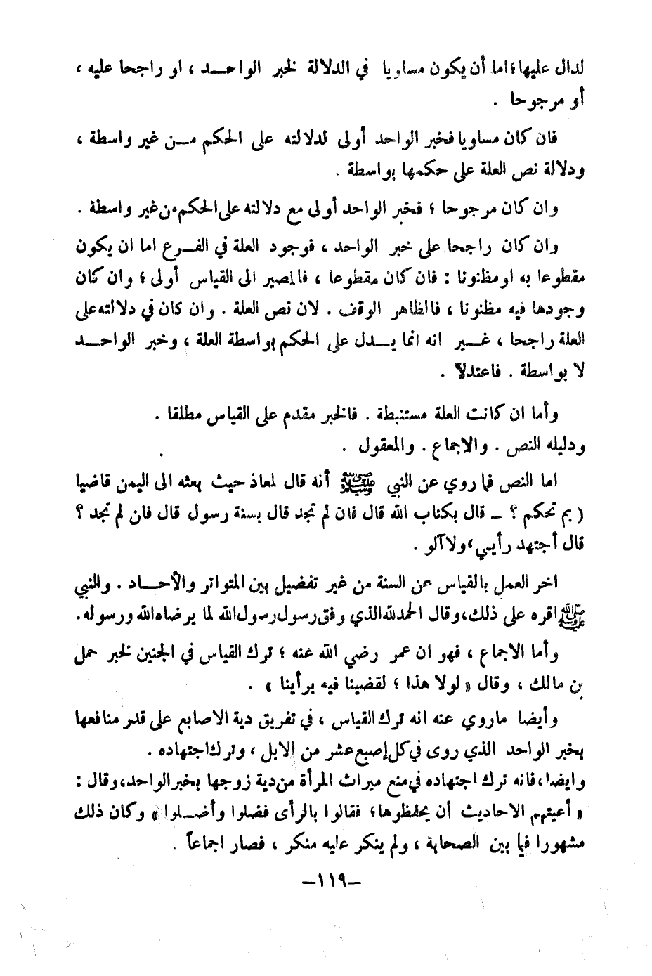 أَمَّا النَّصُّ فَمَا رُوِيَ عَنِ النَّبِيِّ صَلَّى اللَّهُ عَلَيْهِ وَسَلَّمَ أَنَّهُ قَالَ لِمُعَاذٍ حَيْثُ بَعَثَهُ إِلَى الْيَمَنِ قَاضِيًا: ( «بِمَ تَحْكُمُ؟ قَالَ بِكِتَابِ اللَّهِ، قَالَ: فَإِنْ لَمْ تَجِدْ قَالَ بِسُنَّةِ رَسُولِ اللَّهِ، قَالَ فَإِنْ لَمْ تَجِدْ؟ قَالَ: أَجْتَهِدُ رَأْيِي، وَلَا آلُو» .