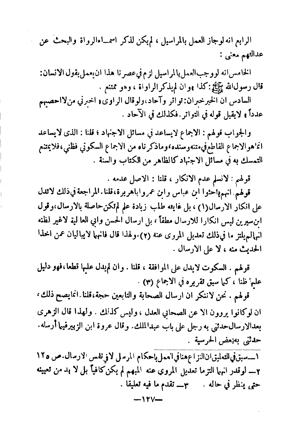 (١) سَبَقَ فِي التَّعْلِيقِ أَنَّ النِّزَاعَ هُنَا فِي الْعَمَلِ بِأَحْكَامِ الْمُرْسَلِ لَا فِي نَفْسِ الْإِرْسَالِ ص ١٢٥