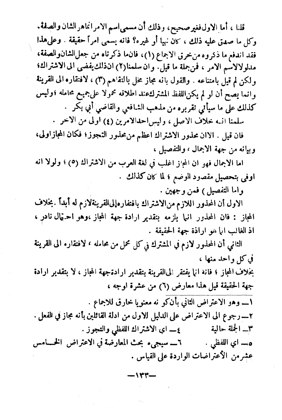 فَإِنْ قِيلَ: إِلَّا أَنَّ مَحْذُورَ الِاشْتِرَاكِ أَعْظَمُ مِنْ مَحْذُورِ التَّجَوُّزِ، فَكَانَ الْمَجَازُ أَوْلَى، وَبَيَانُهُ مِنْ جِهَةِ الْإِجْمَالِ وَالتَّفْصِيلِ، أَمَّا الْإِجْمَالُ فَهُوَ أَنَّ الْمَجَازَ أَغْلَبُ فِي لُغَةِ الْعَرَبِ مِنَ الِاشْتِرَاكِ (٥) وَلَوْلَا أَنَّهُ أَوْفَى بِتَحْصِيلِ مَقْصُودِ الْوَضْعِ، لَمَا كَانَ كَذَلِكَ، وَأَمَّا التَّفْصِيلُ فَمِنْ وَجْهَيْنِ.
