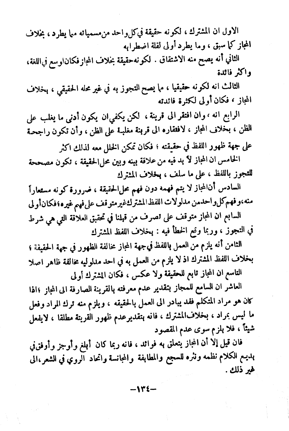 الْعَاشِرُ: أَنَّ السَّامِعَ لِلْمَجَازِ بِتَقْدِيرِ عَدَمِ مَعْرِفَتِهِ بِالْقَرِينَةِ الصَّارِفَةِ إِلَى الْمَجَازِ، إِذَا كَانَ هُوَ مُرَادَ الْمُتَكَلِّمِ فَقَدْ يُبَادِرُ إِلَى الْعَمَلِ بِالْحَقِيقَةِ، وَيَلْزَمُ مِنْهُ تَرْكُ الْمُرَادِ وَفِعْلُ مَا لَيْسَ بِمُرَادٍ، بِخِلَافِ الْمُشْتَرَكِ، فَإِنَّهُ بِتَقْدِيرِ عَدَمِ ظُهُورِ الْقَرِينَةِ مُطْلَقًا، لَا يَفْعَلُ شَيْئًا فَلَا يَلْزَمُ سِوَى عَدَمِ الْمَقْصُودِ.