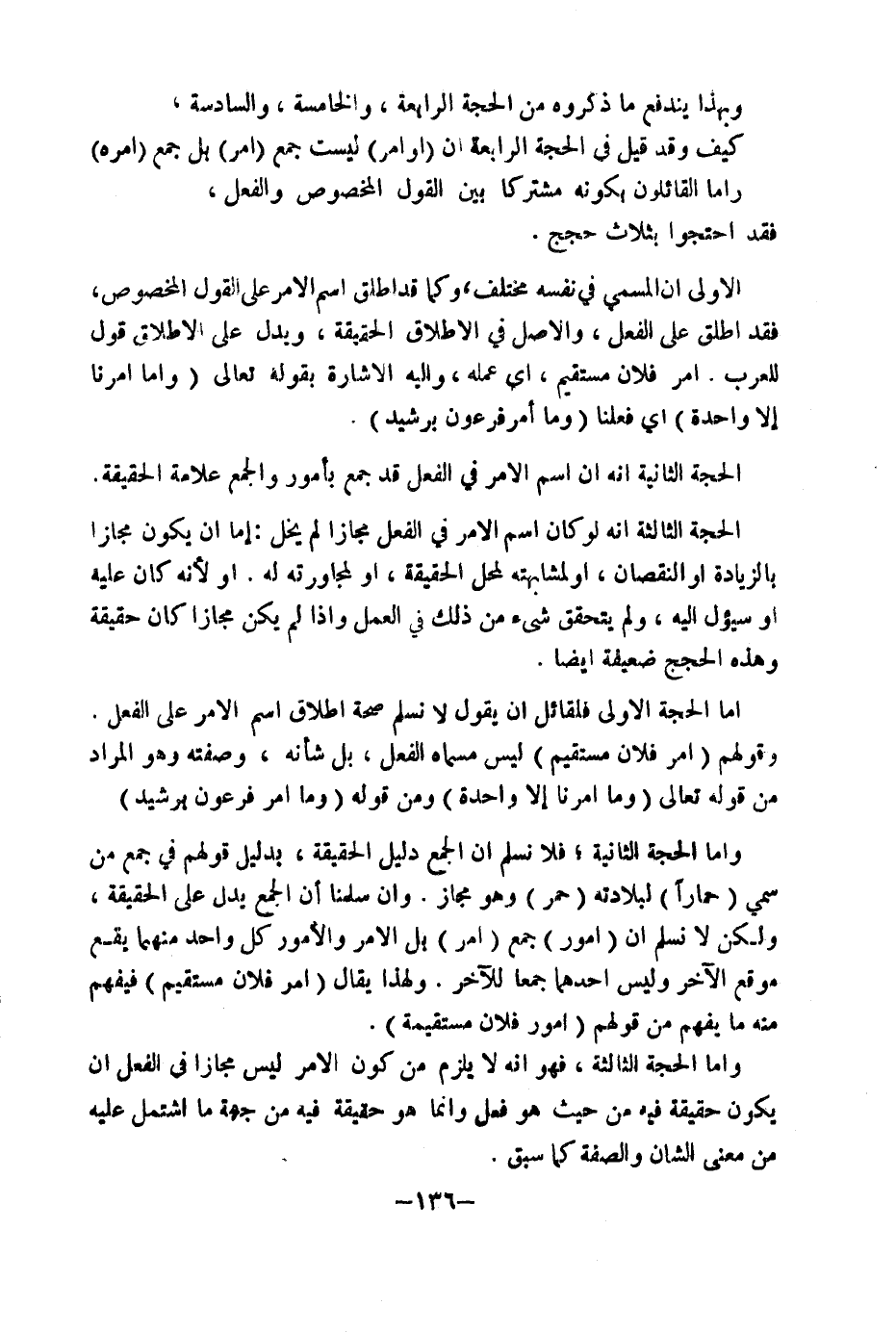 كَيْفَ وَقَدْ قِيلَ فِي الْحُجَّةِ الرَّابِعَةِ إِنَّ (أَوَامِرَ) لَيْسَتْ جَمْعُ (أَمْرٍ) بَلْ جَمْعُ (أَمْرَهُ) وَأَمَّا الْقَائِلُونَ بِكَوْنِهِ مُشْتَرِكًا بَيْنَ الْقَوْلِ الْمَخْصُوصِ وَالْفِعْلِ، فَقَدِ احْتَجُّوا بِثَلَاثِ حُجَجٍ.