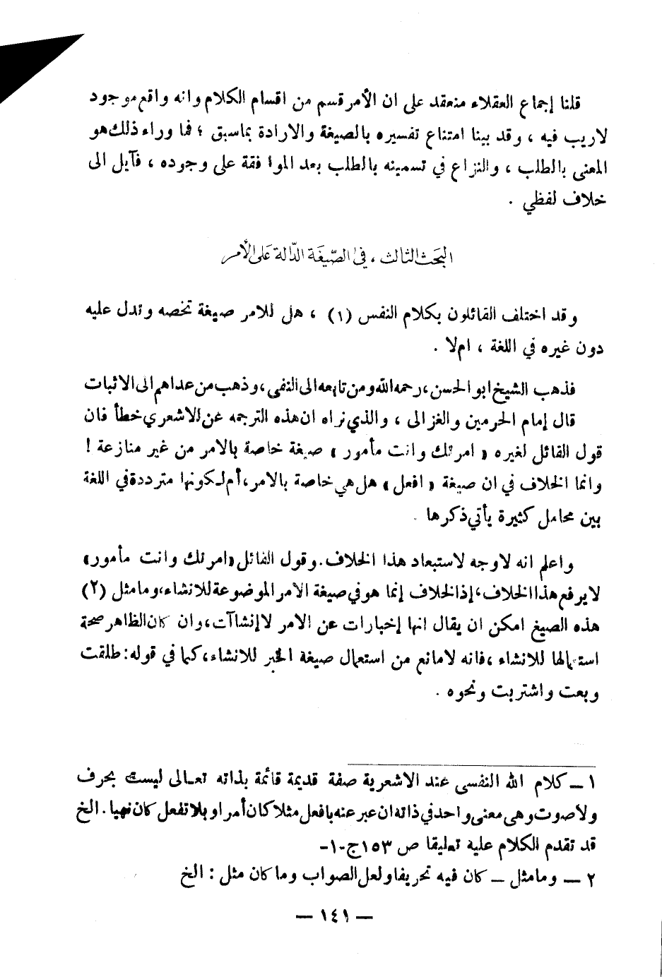 وَقَدِ اخْتَلَفَ الْقَائِلُونَ بِكَلَامِ النَّفْسِ (١) هَلْ لِلْأَمْرِ صِيغَةٌ تَخُصُّهُ وَتَدُلُّ عَلَيْهِ دُونَ غَيْرِهِ فِي اللُّغَةِ، أَمْ لَا.