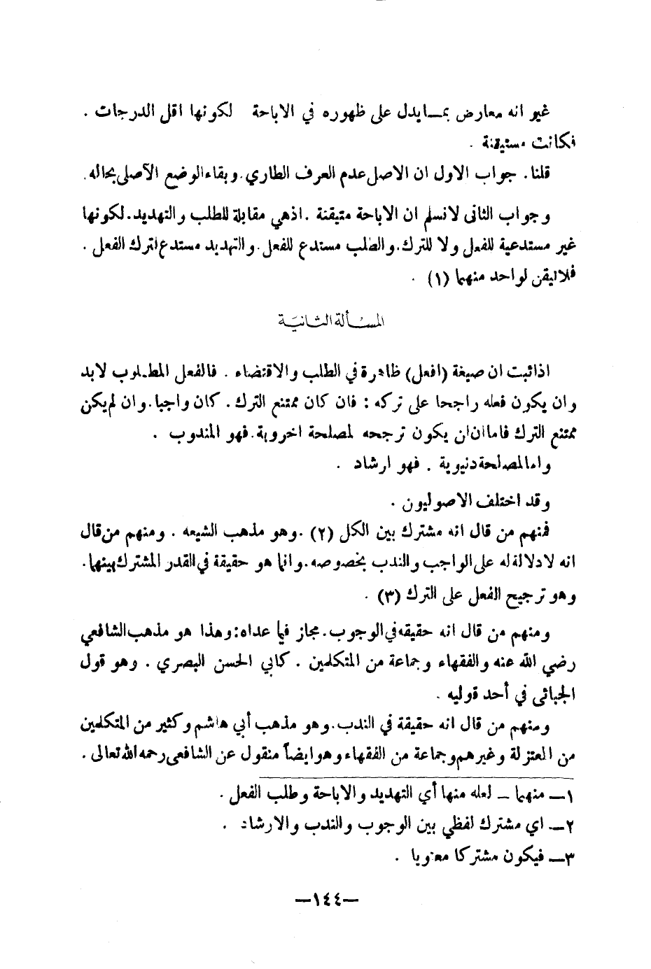 وَجَوَابُ الثَّانِي: لَا نُسَلِّمُ أَنَّ الْإِبَاحَةَ مُتَيَقَّنَةٌ، إِذْ هِيَ مُقَابِلَةٌ لِلطَّلَبِ وَالتَّهْدِيدِ، لِكَوْنِهَا غَيْرَ مُسْتَدْعِيَةٍ لِلْفِعْلِ وَلَا لِلتَّرْكِ، وَالطَّلَبُ مُسْتَدْعٍ لِلْفِعْلِ، وَالتَّهْدِيدُ مُسْتَدْعٍ لِتَرْكِ الْفِعْلِ، فَلَا تَيَقُّنَ لِوَاحِدٍ مِنْهُمَا (١) .