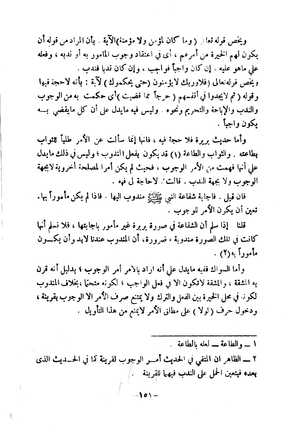 وَيُخَصُّ قَوْلُهُ تَعَالَى: {وَمَا كَانَ لِمُؤْمِنٍ وَلَا مُؤْمِنَةٍ} الْآيَةُ بِأَنَّ الْمُرَادَ مِنْ قَوْلِهِ أَنْ تَكُونَ لَهُمُ الْخِيَرَةُ مِنْ أَمْرِهِمْ، أَيْ فِي اعْتِقَادِ وُجُوبِ الْمَأْمُورِ بِهِ أَوْ نَدْبِهِ وَفِعْلِهِ عَلَى مَا هُوَ عَلَيْهِ، إِنْ كَانَ وَاجِبًا فَوَاجِبٌ، وَإِنْ كَانَ نَدْبًا فَنَدْبٌ.