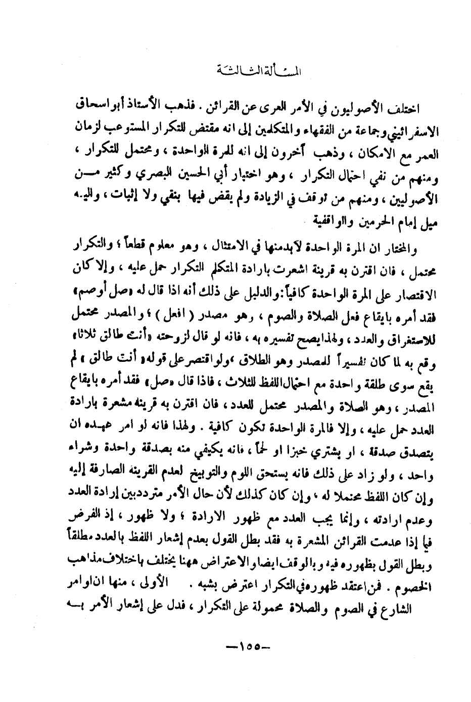اخْتَلَفَ الْأُصُولِيُّونَ فِي الْأَمْرِ الْعُرْيِ عَنِ الْقَرَائِنِ فَذَهَبَ الْأُسْتَاذُ أَبُو إِسْحَاقَ الْإِسْفَرَايِنِيُّ وَجَمَاعَةٌ مِنَ الْفُقَهَاءِ وَالْمُتَكَلِّمِينَ إِلَى أَنَّهُ مُقْتَضٍ لِلتَّكْرَارِ الْمُسْتَوْعِبِ لِزَمَانِ الْعُمُرِ مَعَ الْإِمْكَانِ، وَذَهَبَ آخَرُونَ إِلَى أَنَّهُ لِلْمَرَّةِ الْوَاحِدَةِ، وَمُحْتَمِلٌ لِلتَّكْرَارِ، وَمِنْهُمْ مَنْ نَفَى احْتِمَالَ التَّكْرَارِ، وَهُوَ اخْتِيَارُ أَبِي الْحُسَيْنِ الْبَصْرِيِّ: وَكَثِيرٍ مِنَ الْأُصُولِيِّينَ، وَمِنْهُمْ مَنْ تَوَقَّفَ فِي الزِّيَادَةِ، وَلَمْ يَقْضِ فِيهَا بِنَفْيٍ وَلَا إِثْبَاتٍ، وَإِلَيْهِ مَيْلُ إِمَامِ الْحَرَمَيْنِ وَالْوَاقِفَيَّةِ.