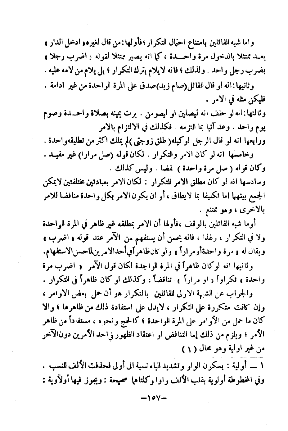 وَالْجَوَابُ عَنِ الشُّبْهَةِ الْأُولَى لِلْقَائِلِينَ بِالتَّكْرَارِ هُوَ أَنَّ حَمْلَ بَعْضِ الْأَوَامِرِ، وَإِنْ كَانَتْ مُتَكَرِّرَةً عَلَى التَّكْرَارِ، لَا يَدُلُّ عَلَى اسْتِفَادَةِ ذَلِكَ مِنْ ظَاهِرِهَا، وَإِلَّا كَانَ مَا حُمِلَ مِنَ الْأَوَامِرِ عَلَى الْمَرَّةِ الْوَاحِدَةِ، كَالْحَجِّ وَنَحْوِهِ، مُسْتَفَادًا مِنْ ظَاهِرِ الْأَمْرِ، وَيَلْزَمُ مِنْ ذَلِكَ إِمَّا التَّنَاقُضُ أَوِ اعْتِقَادُ الظُّهُورِ فِي أَحَدِ الْأَمْرَيْنِ دُونَ الْآخَرِ مِنْ غَيْرِ أَوْلِيَّةٍ وَهُوَ مُحَالٌ (١) .