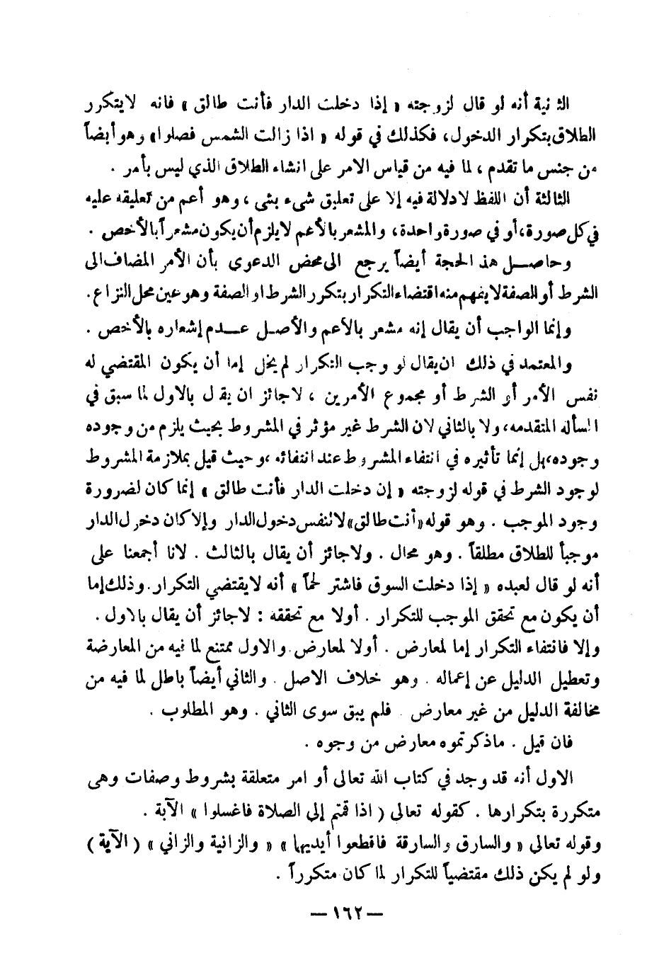 الْأَوَّلُ: أَنَّهُ قَدْ وُجِدَ فِي كِتَابِ اللَّهِ تَعَالَى أَوَامِرُ مُتَعَلِّقَةٌ بِشُرُوطٍ وَصِفَاتٍ وَهِيَ مُتَكَرِّرَةٌ بِتَكَرُّرِهَا، كَقَوْلِهِ تَعَالَى: {إِذَا قُمْتُمْ إِلَى الصَّلَاةِ فَاغْسِلُوا} الْآيَةُ، وَقَوْلُهُ تَعَالَى: {وَالسَّارِقُ وَالسَّارِقَةُ فَاقْطَعُوا أَيْدِيَهُمَا} {الزَّانِيَةُ وَالزَّانِي} الْآيَةُ، وَلَوْ لَمْ يَكُنْ ذَلِكَ مُقْتَضِيًا لِلتَّكْرَارِ لَمَا كَانَ مُتَكَرِّرًا.