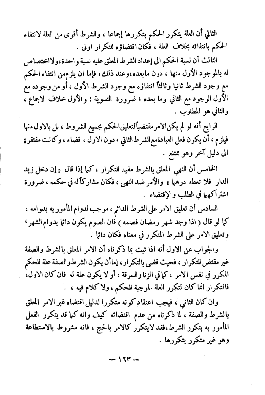 وَالْجَوَابُ عَنِ الْأَوَّلِ أَنَّهُ إِذَا ثَبَتَ بِمَا ذَكَرْنَاهُ أَنَّ الْأَمْرَ الْمُعَلَّقَ بِالشَّرْطِ وَالصِّفَةِ غَيْرُ مُقْتَضٍ لِلتَّكْرَارِ، فَحَيْثُ قُضِيَ بِالتَّكْرَارِ، إِمَّا أَنْ يَكُونَ الشَّرْطُ وَالصِّفَةُ عِلَّةً لِلْحُكْمِ الْمُكَرَّرِ فِي نَفْسِ الْأَمْرِ، كَمَا فِي الزِّنَا وَالسَّرِقَةِ، أَوْ لَا يَكُونُ عِلَّةً لَهُ فَإِنْ كَانَ الْأَوَّلُ، فَالتَّكْرَارُ إِنَّمَا كَانَ لِتَكَرُّرِ الْعِلَّةِ الْمُوجِبَةِ لِلْحُكْمِ، وَلَا كَلَامَ فِيهِ.