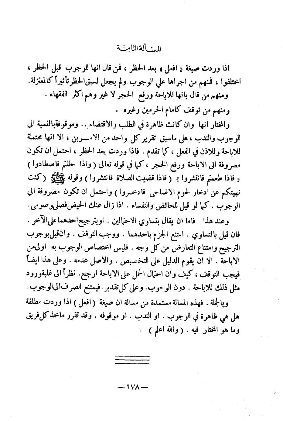 وَبِالْجُمْلَةِ فَهَذِهِ الْمَسْأَلَةُ مُسْتَمَدَّةٌ مِنْ مَسْأَلَةِ أَنَّ صِيغَةَ (افْعَلْ) إِذَا وَرَدَتْ مُطْلَقَةً هَلْ هِيَ ظَاهِرَةٌ فِي الْوُجُوبِ أَوِ النَّدْبِ أَوْ مَوْقُوفَةٌ؟