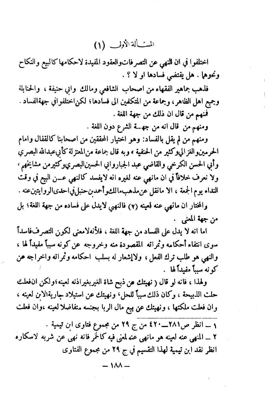 (٢) الْمَنْهِيُّ عَنْهُ لِعَيْنِهِ هُوَ مَا نُهِيَ عَنْهُ لِمَعْنًى فِيهِ كَالْخَمْرِ فَإِنَّهُ نُهِيَ عَنْ شُرْبِهِ لِإِسْكَارِهِ، انْظُرْ نَقْدَ ابْنِ تَيْمِيَةَ لِهَذَا التَّقْسِيمِ فِي ج ٢٩ مِنْ مَجْمُوعِ الْفَتَاوَى
