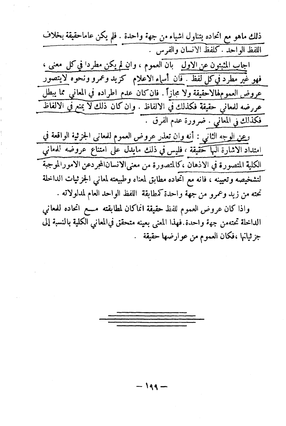 وَعَنِ الْوَجْهِ الثَّانِي: أَنَّهُ وَإِنْ تَعَذَّرَ عَرُوضُ الْعُمُومِ لِلْمَعَانِي الْجُزْئِيَّةِ الْوَاقِعَةِ فِي امْتِدَادِ الْإِشَارَةِ إِلَيْهَا حَقِيقَةً، فَلَيْسَ فِي ذَلِكَ مَا يَدُلُّ عَلَى امْتِنَاعِ عَرُوضِهِ لِلْمَعَانِي الْكُلِّيَّةِ الْمُتَصَوَّرَةِ فِي الْأَذْهَانِ، كَالْمُتَصَوَّرَةِ مِنْ مَعْنَى الْإِنْسَانِ الْمُجَرِّدِ عَنِ الْأُمُورِ الْمُوجِبَةِ لِتَشْخِيصِهِ وَتَعْيِينِهِ، فَإِنَّهُ مَعَ اتِّحَادِهِ فَمُطَابِقٌ لِمَعْنَاهُ وَطَبِيعَتِهِ لِمَعَانِي الْجُزْئِيَّاتِ الدَّاخِلَةِ تَحْتَهُ مِنْ زَيْدٍ وَعَمْرٍو مِنْ جِهَةٍ وَاحِدَةٍ كَمُطَابَقَةِ اللَّفْظِ الْوَاحِدِ الْعَامِّ لِمَدْلُولَاتِهِ.
