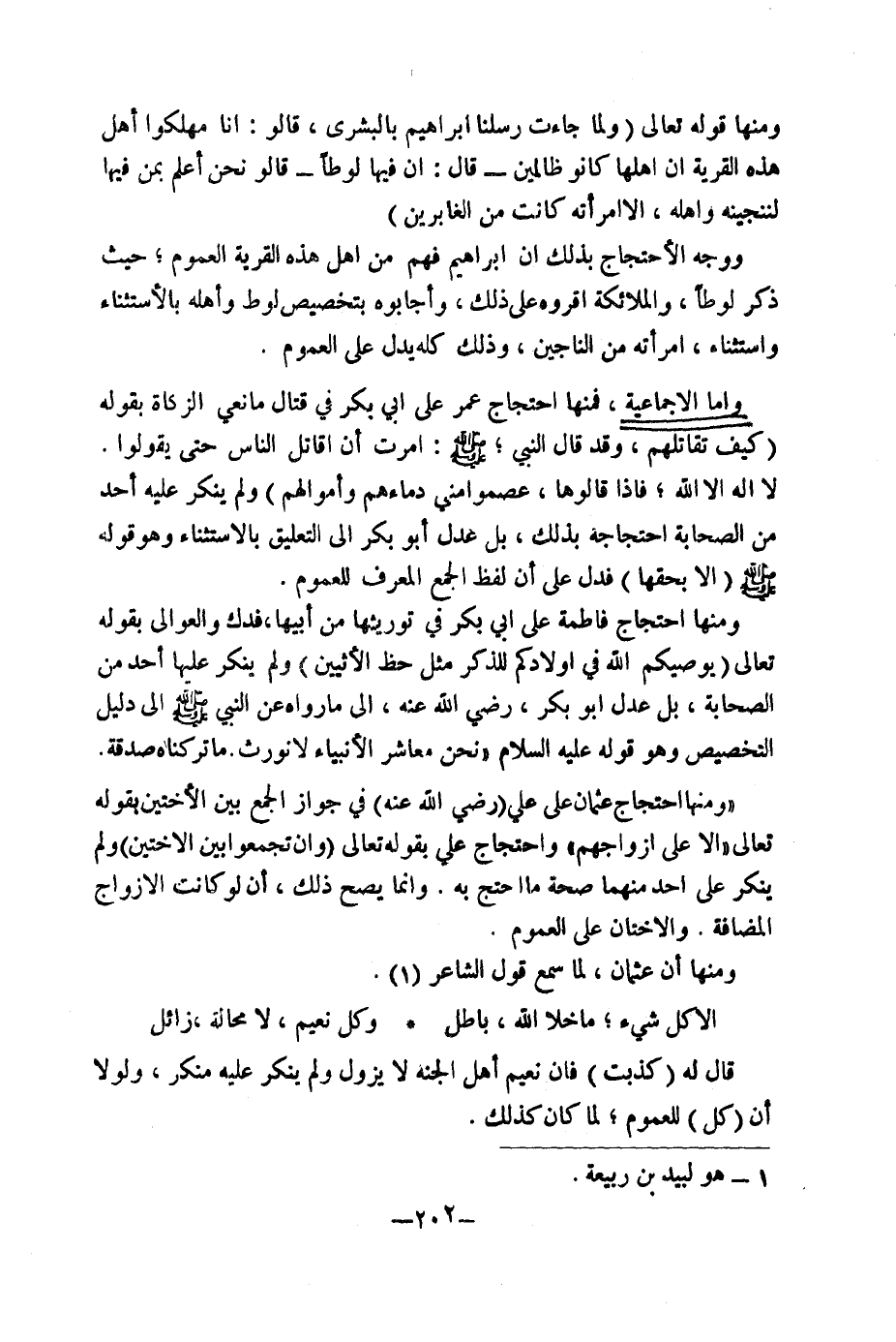 وَأَمَّا الْإِجْمَاعِيَّةُ فَمِنْهَا احْتِجَاجُ عُمَرَ عَلَى أَبِي بَكْرٍ فِي قِتَالِ مَانِعِي الزَّكَاةِ بِقَوْلِهِ: كَيْفَ تُقَاتِلُهُمْ وَقَدْ قَالَ النَّبِيُّ - صَلَّى اللَّهُ عَلَيْهِ وَسَلَّمَ -: " «أُمِرْتُ أَنْ أُقَاتِلَ النَّاسَ حَتَّى يَقُولُوا لَا إِلَهَ إِلَّا اللَّهُ فَإِذَا قَالُوهَا عَصَمُوا مِنِّي دِمَاءَهُمْ وَأَمْوَالَهُمْ» " وَلَمْ يُنْكِرْ عَلَيْهِ أَحَدٌ مِنَ الصَّحَابَةِ احْتِجَاجَهُ بِذَلِكَ، بَلْ عَدَلَ أَبُو بَكْرٍ إِلَى التَّعْلِيقِ بِالِاسْتِثْنَاءِ وَهُوَ قَوْلُهُ - صَلَّى اللَّهُ عَلَيْهِ وَسَلَّمَ -: " «إِلَّا بِحَقِّهَا» "، فَدَلَّ عَلَى أَنَّ لَفْظَ الْجَمْعِ الْمُعَرَّفِ لِلْعُمُومِ.