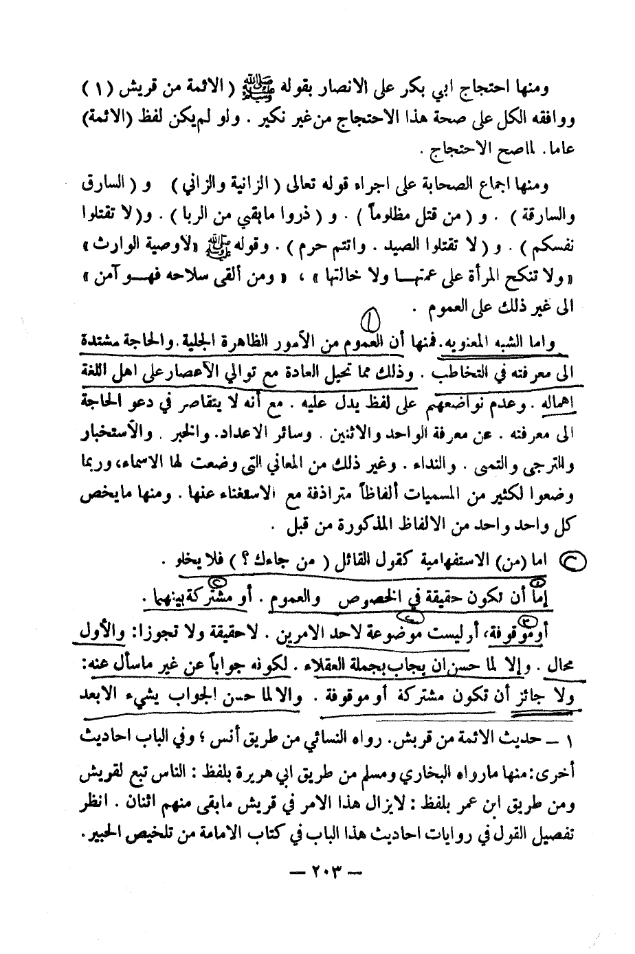 وَمِنْهَا احْتِجَاجُ أَبِي بَكْرٍ عَلَى الْأَنْصَارِ بِقَوْلِهِ - صَلَّى اللَّهُ عَلَيْهِ وَسَلَّمَ -: " «الْأَئِمَّةُ مِنْ قُرَيْشٍ» " (١) وَوَافَقَهُ الْكُلُّ عَلَى صِحَّةِ هَذَا الِاحْتِجَاجِ مِنْ غَيْرِ نَكِيرٍ، وَلَوْ لَمْ يَكُنْ لَفْظُ (الْأَئِمَّةُ) عَامًّا لَمَا صَحَّ الِاحْتِجَاجُ.